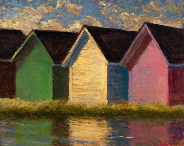 Curator: This piece, by Mark Beck, titled "The Shadow", strikes me with its rather melancholic feel despite the warmth trying to break through. Editor: Absolutely, there's an odd beauty in it. Look at how the impasto technique—those thick globs of oil-paint—capture this sense of heaviness. And it's plein-air. Makes you wonder about the physical act of painting this outdoors, what kind of brushes were used, maybe even what brand. Were these materials easily available? Curator: I’m almost picturing Beck squinting, grappling with the light in that specific moment. There’s something lonely about the rows of structures...boathouses? It’s repetitive but then there’s that singular darker opening in the structure second from the left, just catching the eye like a secret waiting to be told. Editor: Indeed! The light tells half the story, and the construction another part of it. Those simplified gable-roof buildings are repeated and yet slightly differentiated – likely they served similar industrial roles along the river or waterway. How were those spaces used? Were they personal or state-owned, what kind of access did locals or workers have to these spaces? It’s a question of labor as much as light. Curator: The buildings are mirrored ever so softly in the water, reflecting light on the river’s surface but distorting it all the same. As if memory or feeling, that act of recalling is inherently subjective, twisting perception in an intriguing and captivating way. Editor: I agree, that distortion really resonates, especially when you consider the socio-economic realities often reflected in working landscapes. I wonder how that particular location has evolved. Curator: It's like a study in contrasts: shadow and light, presence and absence. What seems stable at first is immediately questioned by the mutability of shadow and water. Editor: True, the interplay reflects both artistic labor, environmental factors and perhaps shifts in material conditions of labor over time, don't you think? It offers more questions than it gives answers, somehow. Curator: Precisely! "The Shadow" is deceptive—simple on the surface but brimming with contemplative substance and mood beneath, even now!