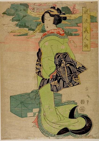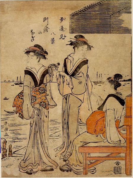 Editor: Here we have Kikugawa Eizan’s *Women Gathering Shells at the Beach*, date unknown. It's a vertical print of women wading in the surf, and the whole scene feels so delicate. What stands out to you in this work? Curator: The shells they gather are not just objects; they are symbols of fertility and good fortune deeply woven into the cultural tapestry of the time. Consider how the sea itself acts as a potent symbol of renewal and the cyclical nature of life. Do you see how their activity connects them to these ancient, resonant themes? Editor: That makes me see the women less as figures and more as participants in an ongoing, almost timeless, ritual. Thanks! Curator: Indeed, and their presence reminds us of the enduring human connection to both nature and tradition.