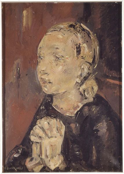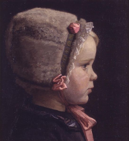 Editor: Here we have Paula Modersohn-Becker's "Girl's Head with a Striped Cap in Profile to the Left," painted around 1905. It's an oil painting, and what strikes me immediately is the gravity in her gaze. It feels so mature, almost haunting, for a child. What do you make of it? Curator: It's a compelling piece, isn't it? The striped cap itself acts as a signifier, immediately locating us within a specific cultural context. Head coverings often denote status, marital status, or even religious affiliation. What does the positioning in profile communicate to you? Editor: It feels more distant, less confrontational, like we're observing rather than interacting. Curator: Precisely! Becker is very deliberately using established portrait conventions to convey something more profound. The profile view lends itself to symbolic readings - a suggestion of hidden depths or a story waiting to be revealed. Do you think the colours evoke any particular emotion? Editor: The muted tones make it feel very grounded, very earthy, almost melancholic. Curator: The earth tones do more than just create a mood. Think about how, across cultures, earth is frequently associated with both life and death, growth and decay. Consider this along with the German Expressionist movement she belonged to. They actively distorted forms and colours to convey emotion. Does knowing that inform your viewing? Editor: Absolutely. It helps me see beyond just a portrait and more into the artist's emotional landscape, what she wanted to convey about girlhood, identity, and maybe even mortality. It’s much more than just an image now. Curator: Indeed, and that striped cap? No longer simply fabric, but a loaded cultural artifact whispering stories of tradition and place.