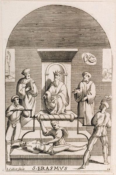 Editor: This is Jacques Callot's "Saint Rainelda," an etching from the early 17th century. It depicts a rather gruesome scene. What strikes me is how the composition, framed within this oval, almost normalizes the violence. How do you interpret this work? Curator: It's essential to consider the social context. Callot's images circulated widely, shaping perceptions of religious figures and martyrdom. Notice how the architectural setting lends a stage-like quality to the violence, turning it into a public spectacle. Editor: So, it’s not just about Rainelda’s individual suffering but about the public role of such imagery? Curator: Precisely. The print functions as a form of propaganda, reinforcing religious ideals through graphic depiction. Understanding that helps us grapple with its unsettling aesthetic. Editor: That definitely shifts my perspective; it’s less about the individual and more about the politicization of faith. Thanks! Curator: Indeed. Analyzing the visual culture of the period opens up new avenues for understanding the art's impact.