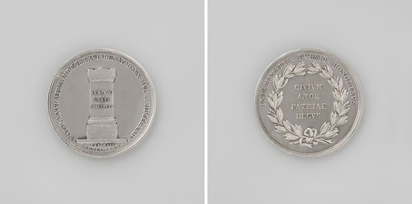 Curator: Right, let's dive into this little wonder. Editor: So, here we have "Herstel van Willem, kroonprins der Nederlanden van een ernstige ziekte," made of metal in 1835 by David van der Kellen. It commemorates Prince William’s recovery. It’s giving me neoclassical vibes, like a tiny, shiny monument, but I wonder what's it trying to say? What's your take? Curator: This is not just a shiny bauble; it’s a piece brimming with early 19th-century optimism. Imagine the relief that followed Prince William's recovery! This piece serves as public gratitude. See how the figure of the Dutch maiden is resting a gentle hand upon the Prince’s bust? Notice the lion of the Dutch coat of arms there, too? I sense a desire to convey this sentiment in a timeless idiom through the neoclassical style; don't you think that’s clever? Editor: Definitely clever, showing their hopes through a timeless figure, so very different from the modern media announcements, do you think? Curator: Precisely. Consider the language here; in the 19th century they used symbolism, not Twitter! So, what did we just learn from a small coin? Perhaps, gratitude and hope expressed through a controlled artistic language? Editor: Absolutely. I see it now, it’s not just a coin; it’s a carefully crafted expression of a nation’s sentiment, pressed in metal for prosperity. Curator: Beautifully said!