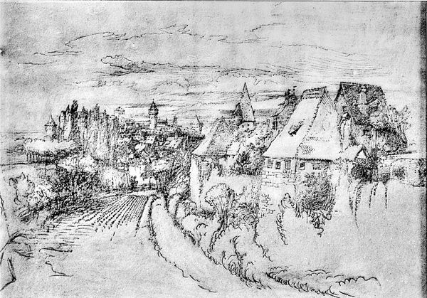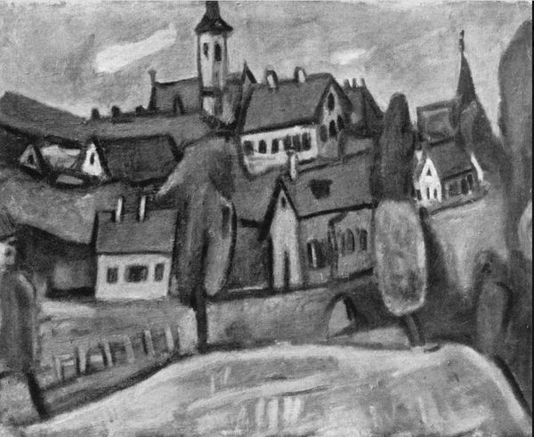 Editor: This is Albert Gottschalk’s "Gade i Stege," painted in 1903. The impasto application of oil paint really gives this cityscape a feeling of gritty realism, even though it's in monochrome. I'm curious, what strikes you when you look at it? Curator: What immediately jumps out is how Gottschalk uses a seemingly neutral cityscape to convey deeper societal meanings. A church steeple, houses huddled together… it subtly highlights the role of institutions and community in early 20th-century Danish life. Do you notice how the street almost funnels our gaze toward that central steeple? Editor: I do. It’s almost like the church is passively watching. But does it give commentary on its social environment? Curator: I think so. Consider the period: shifts in power, nascent urbanisation. The painting subtly suggests a dialogue between traditional structures and evolving society. The choice of this view, a common street made monumental, emphasizes how everyday life becomes part of the grand narrative. Editor: So the location and composition are loaded, but isn’t that true for any cityscape, whether on purpose or accidentally? What do you think Gottschalk was trying to get the audience to *do*? Curator: Good question! Perhaps he’s nudging us to consider the undercurrents shaping our world. Street scenes in art became potent tools for depicting social change. "Gade i Stege" then transcends being a simple landscape; it transforms into a public declaration about the shared human experience and its direction. Editor: It is fascinating to consider how such a seemingly quiet street can speak volumes about society. Thanks for opening my eyes to the history layered within the brushstrokes! Curator: And thank you for bringing fresh perspective. Looking at art with an awareness of historical context deepens the conversation for all.