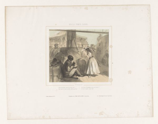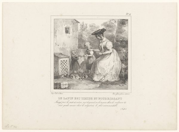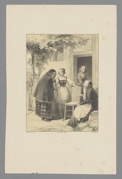 Editor: Auguste Raffet's etching from 1834, charmingly titled "Boer poseert lachend voor een man die een portret maakt," or "Farmer posing and smiling for a man making a portrait" strikes me as a little theatrical. There's almost a sense of performance about it. What do you see when you look at this print? Curator: You know, it’s funny you say "theatrical," because that’s exactly where my mind wanders! Think about this frozen moment; Raffet’s inviting us into a world where art is encountering real life, isn't he? Here's this farmer, seemingly the center of his community, having his likeness captured, perhaps for posterity or just a bit of local amusement. Editor: Absolutely! The onlookers definitely add to that sense of staged drama. What do you think Raffet was trying to say through this captured moment? Curator: Maybe he’s musing on the democratizing power of art? Consider that prints, at this time, made art more accessible. Could Raffet be suggesting that art isn't just for the elite, but for the "everyman," immortalized, quirks and all? Perhaps there is an element of Romanticism and idealized peasants; although classified as Realism, I feel he may be flirting with both concepts in order to capture the scene. And, is it just me, or does that dog look particularly pleased with itself? Editor: Ha! You’re right. Maybe the dog's the real artist here, judging by that proud posture. But seriously, this has made me think about how portraiture itself can be a performance, for both the artist and the sitter. Curator: Exactly! And Raffet beautifully captures that fragile dance between subject, artist, and audience. Next time you’re sitting for a photograph, remember Raffet’s farmer—you're part of a long and lovely tradition of human expression!