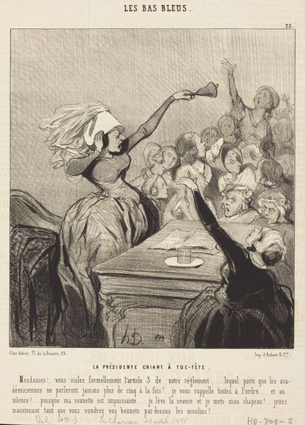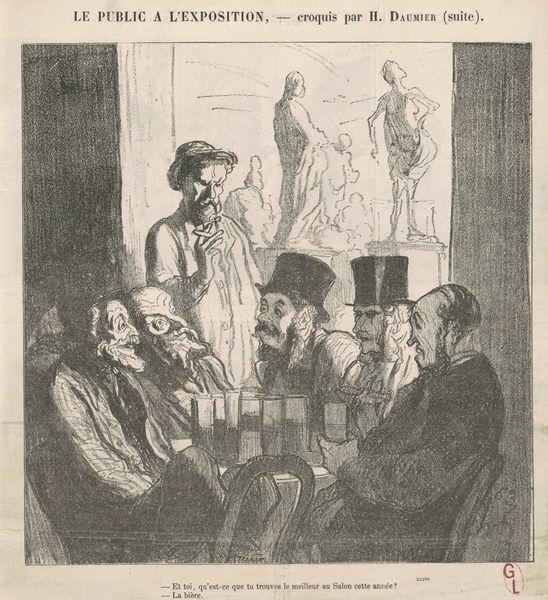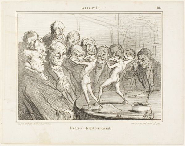 Curator: This lithograph is entitled "Decadence of Drama in 1866," created by Honoré Daumier in, well, 1866. What strikes you upon first glance? Editor: Oh, it's heavy! Like wading through treacle. Everyone seems trapped, maybe by boredom, or…something heavier? Curator: Daumier's mastery shines through in how he uses line to create texture and volume, wouldn't you agree? Observe the strategic hatching, especially around the faces; he uses dense clusters to indicate shadow and depression. Editor: Totally. You almost feel their sweaty brows. It feels like being stuck in a humid room with terrible air circulation and an even worse play. The expressions! That guy on the right is practically drowning in his own sorrow. Curator: It's important to contextualize this piece within Daumier's oeuvre. He often satirized the bourgeoisie and contemporary social issues. His caricatures, though humorous, often contain poignant social commentary. Here, the audience *is* the drama, not the stage. Editor: Exactly! The real show is their utter misery, or indifference. Look at that smug chap on the left. Probably thinks he's above it all. I bet Daumier's laughing at us laughing at them! Curator: Perhaps. Or perhaps he’s holding a mirror to our own tendencies toward passive consumption, our willingness to accept mediocre spectacle. The dramatic lighting further enhances this sense of voyeurism. Editor: True, we're implicated, aren't we? It's more than just a funny jab; there’s a subtle nudge towards self-awareness. So much meaning conveyed through essentially lines on a page! It is genius at the service of discomfort! Curator: Yes, it’s this masterful blending of formal technique and social critique that continues to resonate so powerfully, and marks it so thoroughly in the Realist camp. Editor: I still can't shake the heaviness of it, though. Like a prelude to a really, really bad hangover. A masterpiece of gloom!