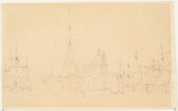 Editor: So, this pen drawing, "Gezicht te Eindhoven met het raadhuis," made sometime between 1701 and 1759 by Cornelis Pronk, has this delicate, almost ethereal quality, doesn’t it? It reminds me of old maps, faded with time. What first strikes you about this cityscape? Curator: The architectural rendering itself speaks to a very specific pride in civic identity, wouldn’t you agree? This isn't just a picture; it's a deliberate record. The church tower dominates the composition. What does a soaring religious structure represent to a community in the 18th century? It's an assertion of faith, permanence, and power all in one visual symbol. Editor: It's like the architecture *is* the statement. The sketch feels so precise, almost technical. It doesn't feel like something deeply personal but a record of place, even for the artist. Curator: Exactly. But what stories are etched in those lines? The delicate drawing style suggests the meticulous work of a cartographer, each line, corner, brick with its meaning and role. And that spire, the script at the top– consider how people found orientation, meaning, *themselves* within the structure of that city. This city literally frames their world. Editor: That really shifts my thinking. It's more than just lines; it's a coded cultural landscape. Curator: Indeed! Now, knowing what you do about the prevalence of symbolism in Baroque art, consider how an understanding of Eindhoven might differ for us, seeing it centuries later versus a resident seeing that same view. It reminds us that every depiction, even one that appears straightforward, has layers waiting to be uncovered, no? Editor: Definitely. I’ll never look at an old cityscape the same way again. Thanks!
