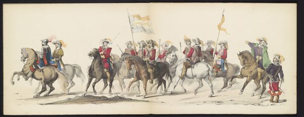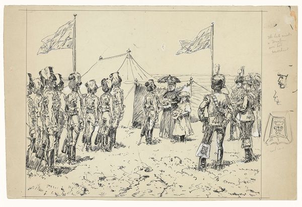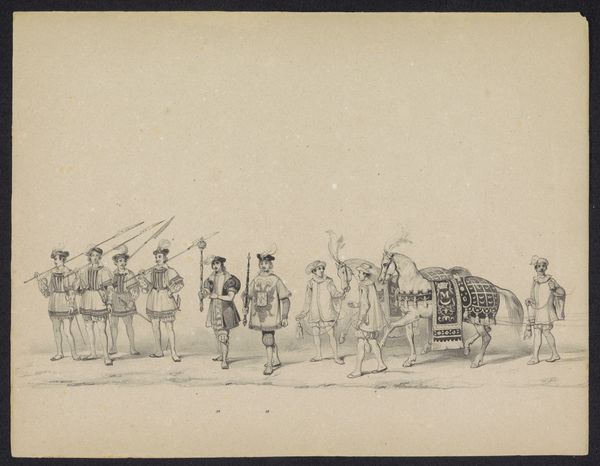 Editor: So this is "Maskerade van de Utrechtse studenten, 1846," by Carel Christiaan Antony Last, created around 1847, currently at the Rijksmuseum. It’s an ink drawing, almost like a detailed illustration. It looks like two separate groups in period costume marching in formation. How do you see this artwork in terms of its visual construction? Curator: Intriguing. From a formalist perspective, I am immediately drawn to the pronounced contrast between the two distinct groups. Consider the pen work. The application of ink defines the costumes. The lines appear rather rigid. Notice the deliberate arrangement of the figures. Each stands at attention to produce a predictable formation. Observe also, if you will, the subtle difference in attire separating each company and their precise placement, forming distinct, visual masses. What is the impact of this binary arrangement, do you suppose? Editor: I guess the composition draws attention to how Last divided these people based on visual and social cues, perhaps contrasting different roles or status through costume. Curator: Precisely. Consider the interplay between light and shadow achieved solely through hatching and cross-hatching. The uniformity within each group, enhanced by repeated forms, also prompts an assessment of variety across the whole. The piece’s structure then reinforces its central binary contrast, achieved through line and compositional organization. It evokes a dynamic of both harmony and counterpoint. Are we witnessing here, therefore, more than simply the rendering of two disparate groups? Editor: I think seeing how the artist plays with form and composition helps understand the different intentions of these contrasting groups, moving beyond their surface-level appearance. Curator: Exactly. The artist achieves a structured analysis through careful visual arrangement of its constitutive elements. A semiotic approach, where each symbol – costume, weapon, stance – creates an intriguing dialog on societal codes, in this masquerade. Editor: I've certainly gained a new viewpoint in understanding visual symbolism today!