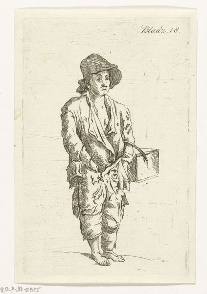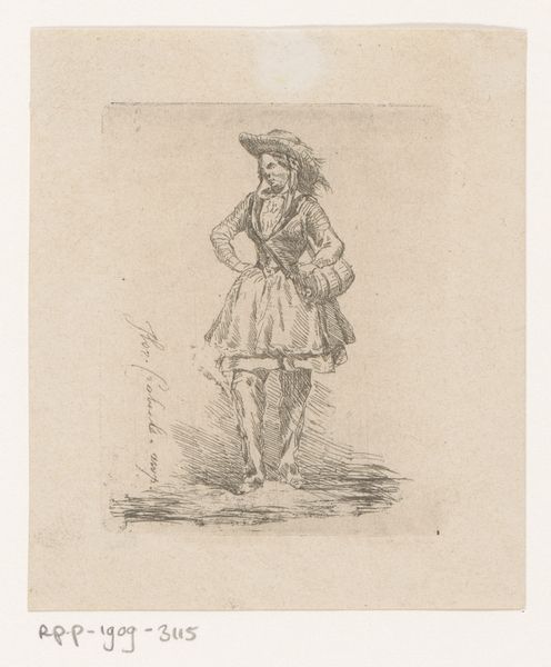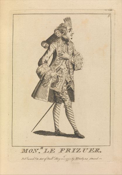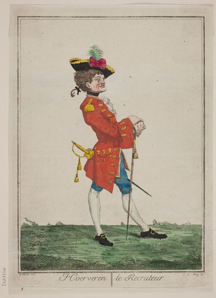 Curator: This is "No. 5: Midshipman," a print from 1799 by Henri Merke. What strikes you about it? Editor: It's quite detailed, considering it's a print. The midshipman seems almost meticulously drawn, but there’s something subtly humorous about the way he's depicted, like a caricature, which is a printed image, multiplied using industrial means and available to a mass audience. What's your take? Curator: I agree about the humorous edge, but I’m more interested in its mass appeal. Think about who had access to prints like this. It wouldn't be the midshipman himself, most likely. Instead, it points to a burgeoning middle class with disposable income and an appetite for images, for entertainment tied to status. Editor: So, you're saying it’s not just about the subject of the print but more about the *consumption* of it? How the emerging middle class displayed art in their houses, as status objects, even if a caricature. Curator: Precisely. The means of producing images—printing techniques—democratized art, to a degree, but also commodified social class, making it visible, material. How do you think that material access affects the perception of social classes and hierarchy? Editor: That’s fascinating, it makes it like owning the image means owning part of the perceived identity... It kind of removes the distance from the source to the receiver! Now when I look at it, the seemingly innocent portrait unveils another message. Curator: It is the fascinating double edge of these kind of representations. And in the same way they helped to generate identities, they contribute to perpetuate social biases of the era.