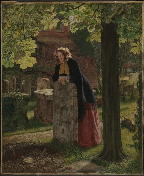 Curator: Welcome. We're standing before Arthur Hughes' "Home from the Sea," completed in 1862. What's your first impression? Editor: A somber tone strikes me first. Look at the figures--a boy lying face down on the ground beside a girl in what appears to be mourning garb. The setting near the church underscores that gravity. It's so heavy with grief; I wonder what choices in its material execution lend to this feeling. Curator: Indeed, there’s an undeniable feeling of loss, accentuated, I think, by Hughes’ deliberate placement of symbols. The churchyard, naturally, speaks of death and remembrance. Note too, the fallen petals scattered on the grass; symbols of lost innocence and fleeting beauty. Editor: And it's all rendered with incredible attention to texture. You can almost feel the weight of that coarse wool of their clothing or the dampness of the grass on skin. The means by which that realism is created really brings the scene to life, intensifying the subjects’ emotional states. I want to know how Hughes achieved this level of detail in his oil painting. Did he grind his pigments himself, engaging the Pre-Raphaelite interest in reclaiming some aspects of traditional artistic creation? Curator: Hughes, aligned with the Pre-Raphaelites, embraced a kind of symbolic realism. That careful attention to detail you mentioned was meant to reflect a deeper, spiritual truth. The boy in sailor's attire, for instance, likely represents a life lost at sea, a common tragedy in those days, which this churchyard setting may represent. The girl’s averted gaze reinforces the emotional distance and silent suffering that were associated with proper mourning during this period. It’s as if they are performing prescribed gendered grief roles in that moment. Editor: You bring up an important point about performance. This period emphasized displays of sentiment—often crafted through objects and adornment like mourning garb. Hughes capitalizes on visual material cues to enhance narratives about loss and gender roles within a growing manufacturing economy that supplied goods for public performances of mourning like those on display in "Home From the Sea". Curator: And such social customs find expression in artwork in fascinating ways, providing access into both private and shared meanings during a specific moment in time. I hadn't considered how integral material culture was to articulating identity back then. Editor: Exactly! Thinking about it now, perhaps understanding the means and social relationships of production of Hughes’ material helps unlock even deeper truths about the symbolic gravity he expresses on this canvas.