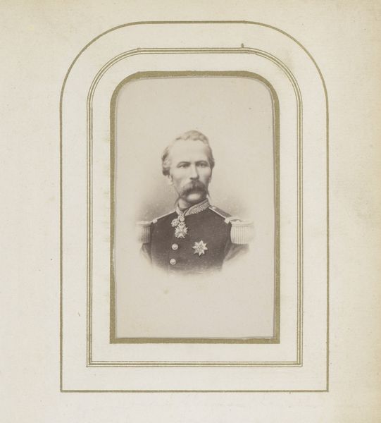 This is a photograph titled 'Portret van een militair', made by Kannemans & Zoon. The photograph presents a muted palette, dominated by sepia tones. The figure of the military man is centrally positioned, his dark uniform a stark contrast to the faded background. The composition is simple: the subject gazes directly forward, creating a symmetrical balance. The light softly illuminates his face, emphasizing his mustache and the determined set of his eyes. The formal rigidity of the portrait speaks to the codes of representation in military portraiture. It’s a study in contrasts—light and dark, soft focus against sharp detail—that invites us to consider how identity is both constructed and revealed through photographic means. This image, though seemingly straightforward, destabilizes easy interpretations, prompting questions about representation, authority, and the gaze.