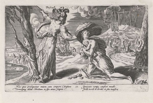 Curator: At first glance, there’s a raw, immediate tension to this print. The cross-hatching, the sharp contrasts… it creates a sense of foreboding. Editor: This etching is called “Jason,” made by Stefano della Bella around the 17th century. It depicts the hero Jason, from Greek mythology, after slaying the dragon guarding the Golden Fleece. It is currently in the collection of the Minneapolis Institute of Art. Curator: Ah, Jason. Note how he stands almost aloof despite the dramatic deed, and consider the meaning behind the dragon, not just as a literal obstacle. We can consider it as a psychological projection of his internal conflict? Perhaps also a symbol of societal and cultural transformations occurring during Jason’s voyage? The slain dragon almost seems diminished, yet it represents enormous hidden forces. Editor: That's an interesting take, interpreting the slain dragon. I read more dominance. Considering Bella’s focus on line and form, particularly evident in the hero’s stance – erect and assured – it emphasizes Jason's victory. How does the surrounding environment speak to you, visually? Curator: The tree from which the Fleece hangs is almost as important as the figures in the foreground. The Fleece represents the highest ideals or treasure. That placement in the tree carries symbolic importance too, associating wisdom, growth, knowledge with this goal and the power needed to obtain it. The Fleece itself hangs from that tree of knowledge like… fruit to be picked. Editor: Fascinating. Considering the art itself as an object, notice the relatively limited tonality achievable through etching. Della Bella masterfully uses these limitations, though. Observe how the etching lines are used to show spatial recession through strategic mark making and how texture contrasts, where the eye tends to linger on the darker, heavily etched parts like the dragon, driving a certain visual hierarchy within the relatively flat, linear medium. Curator: It reflects humanity’s quest for ideals…but I always think about the repercussions—the moral quandaries buried beneath tales of conquest. What did this win *really* cost Jason? It is far from simply "good triumphs over evil". Editor: Yes, and thinking about that narrative is something the formal elements almost enforce. Della Bella directs the viewer's eyes along a visual narrative that guides one through each stage in his line making, with moments of extreme detail countered by moments of relative calm, a kind of effective use of negative space that helps create this picture as more than just its contents, it has motion, pacing... a truly dynamic composition! Curator: Well, I'm happy to see we've found some points of harmony while exploring different facets of this fascinating artwork. Editor: Indeed. Each interpretation certainly enhances the experience!