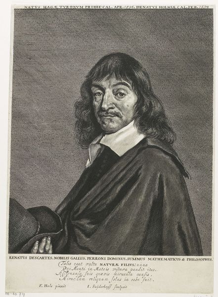 Editor: We're looking at Peter Ilsted’s etching, "Descartes," from 1899, at the SMK. It's rendered in monochrome, using, I believe, charcoal. It seems like a rather intimate, informal portrait, capturing what might be the sitter’s psychological intensity. What do you see in the construction of this piece that stands out? Curator: Certainly, the artist is deliberate in their creation. Notice how Ilsted has meticulously worked the values of the charcoal to create gradations of light. The highlights fall upon Descartes' face, especially the forehead and nose, thus drawing our attention. Look at how these tones emphasize his gaze. Editor: Yes, the play of light definitely shapes how we perceive his expression. It looks almost probing. But is the stark contrast a conscious choice given that Descartes was a controversial thinker? Curator: Consider the technical aspects, however. The contrast is heightened not merely through value, but by the etching and printing process, the material qualities of the etching biting into the metal, transferring the dark lines and shadows onto the paper. Do you agree? Editor: I do. The technical craft involved, and how that interacts with light, definitely determines the final read of his expression. It's more than just light and shadow, it's also the artistic and printing process contributing to its texture. Curator: Indeed. And if one closely studies Ilsted's marks, their unique patterns, one finds their artistic signature within the historical portrait. Perhaps we have looked too closely at Descartes' face and need to look more closely at the etching instead. Editor: Definitely! I can see the way forward into more informed ways of analyzing etchings. Thank you.