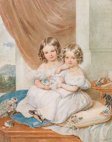 Editor: Here we have an oil painting entitled "Double portrait of two siblings," by George Romney. It is charming, their bond seems so intimate and fragile. How do you interpret this work, especially thinking about its cultural background? Curator: The portrait encapsulates a certain ideal of childhood that was gaining traction in the late 18th century, reflecting a shift in societal views about children and family. Romney's paintings, widely circulated through prints, helped to disseminate this sensibility. Who do you think these children represent, culturally? Editor: Maybe children of the upper class? The delicate clothing, the way they are portrayed, it suggests wealth, right? Curator: Precisely. Commissioning portraits like these was a way for wealthy families to solidify their status and present an image of themselves—consider that this painting acts as a display of their familial harmony and refined upbringing to the public. Notice how their innocence is carefully constructed, don't you think? It’s not just about capturing likeness. Editor: I see. It’s like the family is curating an image, presenting the children and therefore themselves in a certain light. I never thought about portraiture as a sort of "social media" of its time. Curator: It’s precisely that! Moreover, you could wonder what pressures this idealization put on the children. Editor: I guess so. Thinking about how these images shape public perceptions makes you wonder about the unseen realities. Thanks for opening my eyes! Curator: It’s crucial to see art not in isolation but as active participants in cultural dialogues. Examining art through the lens of its socio-historical context helps to reveal profound insights!