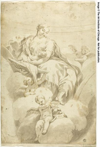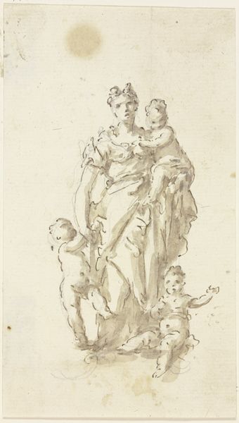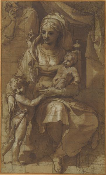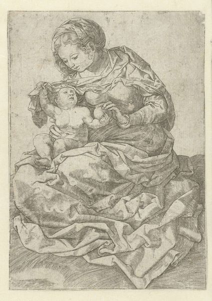 Curator: Welcome. Here we have Vespasiano Strada's "Maria met Kind en vogel," dating from approximately 1592 to 1622, an engraving housed here at the Rijksmuseum. Editor: It’s quite striking how the artist captures such tenderness in a simple monochrome. The way the light falls gives a luminous quality to the scene. Curator: Yes, Strada skillfully utilizes the engraving technique to create a soft, almost hazy effect. Considering the religious and social climate of the time, images of the Madonna and Child served as important visual symbols of piety. They reinforced the Catholic Church's teachings and the role of motherhood. Editor: Precisely, and the composition, though simple, has remarkable depth. Note the strategic placement of the Virgin Mary, occupying a large amount of space, almost possessively drawing our eye to this strong central figure with the divine child and the inclusion of the bird introduces an element of the natural world. The slightly downcast gaze of Mary contributes to the serene and solemn tone. Curator: Right. Such engravings were also often circulated as devotional prints, accessible to a wider audience than large-scale paintings. The presence of the bird, a symbol often associated with the soul or the Holy Spirit, would’ve deepened the spiritual message for contemporary viewers. This artwork serves as an example of religious art functioning within social frameworks and personal devotion during the Renaissance. Editor: And thinking just of artistic interpretation, observe the remarkable expressiveness achieved with simple lines, each contributing to the dynamic yet balanced interplay of light and shadow; truly this piece uses strong diagonals to reinforce movement of both fabric and figure. This, too, adds layers of meaning to an otherwise fairly ubiquitous period trope. Curator: Thinking about this piece in terms of history, this era in art produced powerful emotional artifacts. It certainly encourages consideration about public art and visual culture during the period, but even its more nuanced components encourage historical understanding through beauty and imagery. Editor: A successful synthesis of form and devotion—one can almost feel the sacredness radiating from this quiet domestic scene. A good example of visual piety with careful choices made regarding line, shade, and perspective.