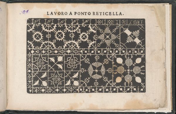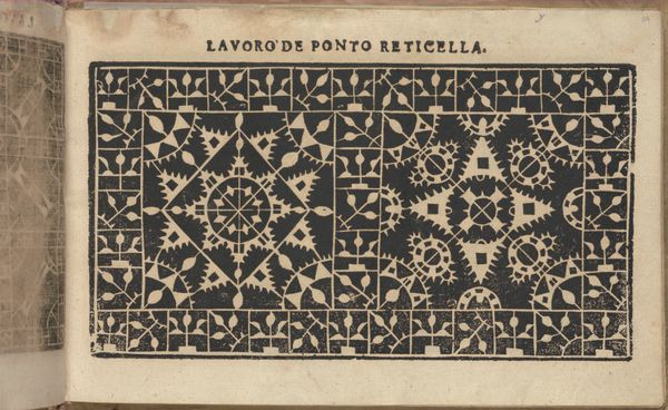 Curator: Look at this page from Isabella Catanea Parasole's "Teatro delle Nobili et Virtuose Donne..." created in 1616. It's a print, an engraving on paper, and such a marvel of detail! Editor: Wow, it feels almost hypnotic. The intricacy of the lace patterns makes me want to reach out and touch it, even though I know it's just a drawing. It gives me the impression that time sort of stops in the process of meticulously recreating lace details... It's so elaborate! Curator: Indeed. The work served as a pattern book. Printed in Italy, such pattern books had an enormous influence on the history of decorative arts and needlework—they were vital in spreading new styles, skills, and the aesthetic ideals of the Renaissance. Editor: And it's clear to me it has so much feminine power. Just imagining noble women sharing the art secrets, helping to keep alive creative energy between women...The symmetry here speaks to a kind of deep-rooted sense of balance that I think is fascinating. It’s like each shape is in constant conversation with the others. Curator: Exactly. These books became significant markers of feminine accomplishment, providing visual references that enhanced the creativity and skill of women across Europe. It reveals how fashion was really used to transmit knowledge! Editor: I suppose there's also something quite modern about this use of repetition; maybe its a pattern for its own sake, but could you see the repetition used in the 20th century. Curator: That’s right—repetition became a key element of modern artistic practice. Also, something that should be considered in Parasole's artwork is its historical significance. Today, embroidery, although very important for fashion houses, is commonly practiced as a leisure activity; in the past, its value in commerce and as an indicator of status can’t be overstated. Editor: Yes, absolutely. It seems Parasole gives the contemporary woman, whether or not she knows embroidery, a glimpse of history in the needle. I like this artwork very much! Curator: Me too. Seeing this print brings one closer to how cultural creation was used centuries ago. It is the kind of art we want our audience to know today and admire forever!