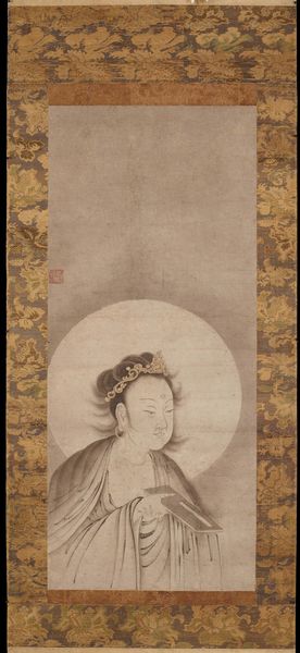 Curator: Here we have a Painted Banner, a Thangka, depicting Vajriputra, one of the Sixteen Great Arhats. It dates to the late 17th or early 18th century. Editor: It’s stunningly ethereal! The landscape dissolves into these pastel washes, creating such a dreamlike space. You can almost feel the meditative calm. Curator: Thangkas such as this one weren’t mere decoration; they were devotional objects. Consider the figure's placement within the composition. The Arhat, identifiable through the attributes of iconography and also a Sanskrit honorific, is centralized and illuminated by his halo. Editor: I'm struck by the materials – the use of tempera and ink gives it a particular texture and luminosity, even on the fabric support. You can sense the artist building layer upon layer, carefully controlling the flow of pigment. What kind of fabric is this painting? Curator: The cultural memory embedded within Thangkas reflects the importance of lineage, and how spiritual authority is transmitted. Every color, gesture, and implement possesses deep symbolic meaning tied to Buddhist beliefs. Editor: And it’s a fascinating social artifact. These weren’t mass-produced items. Think of the labor involved – grinding pigments, preparing the cloth, the meticulous brushwork... and this was designed as a teaching tool. Someone invested a considerable amount of wealth in commissioning this, while an entire community knew how to "read" it, as well. Curator: Absolutely, because it served as an aid in teaching Buddhist principles through narrative and imagery. Every detail down to the facial expressions. Look at his gentle gaze and compare that to his attendant. This reflects compassion and profound wisdom. These would encourage viewers to reflect on the Arhat’s life. Editor: It’s interesting how this integrates the natural world so thoroughly. We see not just human figures, but also animals and elements of landscape which adds depth. Even the surrounding environment becomes a character in this painting. Curator: I agree. The swirling clouds, the blossoming trees all speak to the interconnectedness of all things – a central tenet of Buddhist philosophy, indeed. It’s also speaking to an idealized place, the Pure Land of this tradition. Editor: Knowing more about its creation certainly enriches my appreciation of it as an object and the culture that it served. The artist wasn’t just decorating, he was an educator as well. Curator: For me, appreciating this requires the recognition of it as a historical text capable of enriching my empathy, challenging my presumptions and enriching the story of consciousness itself.