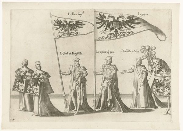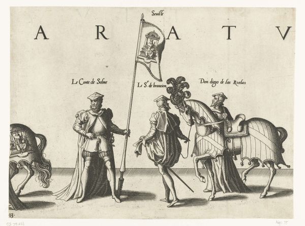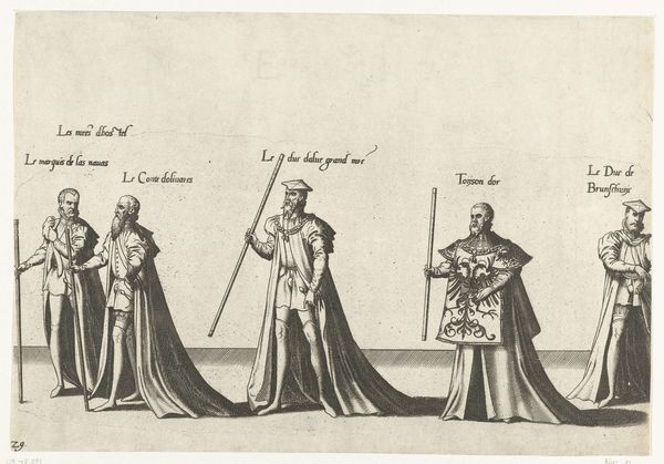 Joannes van Doetechum the Elder created this print, "Part of the Procession, No. 14," sometime in the latter half of the 16th century. It depicts a parade of dignitaries, each identified by name. The image’s meaning lies in its visual encoding of power and social hierarchy. The figures are arranged with careful attention to rank. Banners identify their places of origin. We see that the artist has paid close attention to the details of dress and accoutrements. The work likely reflects the political tensions and the importance of public display within the complex social structure of the Netherlands at the time. Institutions like the court and the church played significant roles in shaping artistic production. Understanding this print involves looking at the history of political symbolism, fashion, and the social rituals of the Dutch Renaissance. Historians use period documents, costume studies, and records of civic events to reconstruct the world that this image represents. Studying art offers a window into a specific time and place, shaped by cultural norms and institutional forces.