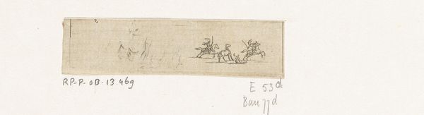 Curator: This delicate etching by Daniel Nikolaus Chodowiecki, created in 1769, is titled "Heer buigt voor twee dames" - "A Gentleman Bowing Before Two Ladies." Editor: My first impression is one of fleeting formality. The composition feels almost incidental, like a captured moment in a play. There is a poignant contrast between the stooped man and the straight upright ladies. Curator: Yes, there's a sense of theater about it. Chodowiecki, working during the Rococo period, frequently explored scenes of daily life, but imbued them with a moral or allegorical undertone. Here, we have the established ritual of bowing, and yet… the context feels ripe for critique. Editor: Precisely! The power dynamics are right there on the surface. Is this respect, genuine admiration, or is it compelled servitude? Consider the era—while outwardly genteel, these aristocratic performances upheld existing social inequalities. We need to interrogate who benefits from these "chivalrous" displays. Curator: The gentleman's exaggerated bow, combined with what seems to be nonchalance from the ladies, evokes a feeling of artificiality, even absurdity. Could it be commenting on the perceived affectations and hollow codes of conduct of the upper classes? Editor: I would also push us to explore potential layers of gender performance happening. Note how rigidly upright and uniform the two women are posed, emphasizing stature. It reads like an active enforcement of social expectations for themselves, and those who interact with them. How does it play into existing tropes that we see of women in art? Curator: An interesting avenue. There is something compellingly stark in this study. Though sketched lightly, Chodowiecki has communicated an attitude that continues to resonate in many respects, reminding us of the artifice found in constructed behaviors and imposed hierarchies. Editor: Indeed, I see it now with fresh eyes. What seems to be just a fleeting snapshot also manages to raise timely questions about power, performance, and privilege. Thank you for illuminating the cultural contexts enmeshed into its lines and forms!