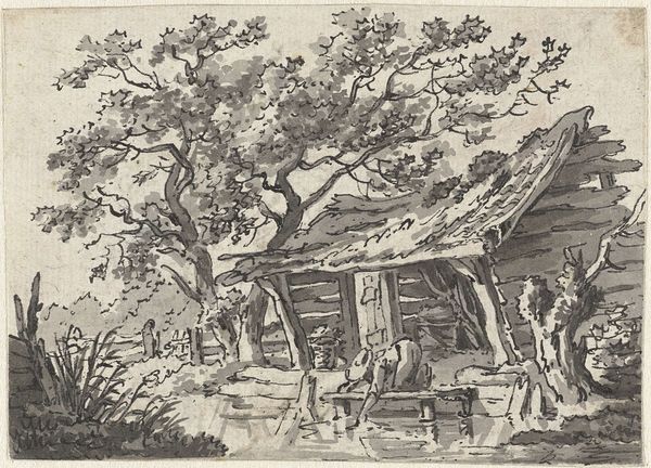 This is Johannes Ludovicus van den Bos's, "Houses with wooden fence between trees," made with pen in the early 19th century. Van den Bos’s short life was framed by the Napoleonic wars and the post-Napoleonic reconstruction of Europe. Look closely, and you’ll notice a figure carrying what appears to be a cross. Juxtaposed with the rustic homes, they introduce a sense of narrative, possibly alluding to themes of faith or pilgrimage, which was a popular theme in the Romantic era. The small size invites an intimate viewing experience, drawing us into the quiet, pastoral scene. Van den Bos captures the emotional and social undercurrents of his time through the lens of everyday life. His subtle portrayal of life’s simple moments reflects both personal introspection and broader cultural values.