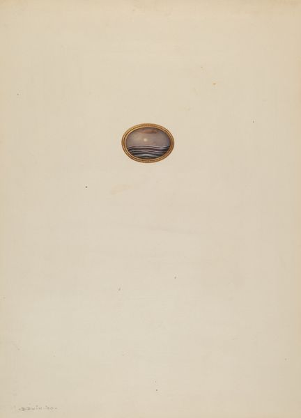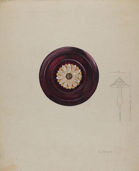 Curator: Look here. Grace Halpin's "Curtain Tie-back" from 1937, rendered in watercolor and coloured pencil. The tie-back, quite large I think, seems ready to hold back the drapes from a grand window. Editor: My first impression is muted elegance, with this antique rose hue in the center medallion. There's also an oddly technical quality to the upper part of the image - with that bare sketch of another ornamental piece floating above. Curator: Indeed. Note the portrait within the tie-back itself. I see a profile that reminds me of a cameo, perhaps a noblewoman, encased in ornate details that seem timeless. It feels like a deliberate invocation of past eras of class privilege - frozen in ornamental time. Editor: And isn't that interesting to consider, especially coming out of the 1930s. We have a pre-war sense of anxiety building up while Halpin seems more concerned with the adornment of a room - albeit beautifully drafted - evoking, as you suggest, an antiquated hierarchy. It raises questions about who has access to beauty, who gets to create it, and whose stories are told - or rather, whose profile is seen? Curator: A fine point! It asks how such details reflect broader societal values about display, taste, and power in the everyday world. Consider the function itself – to contain or liberate, as needed. Perhaps there's also an unconscious exploration of restraint versus freedom. Editor: Absolutely! And on a slightly different track, the artistic choice of combining meticulous colour work alongside those almost diagrammatic sketches above creates this tension. This, too, points to ideas of domesticity and its historical representation, and then challenges it via a contrast to spare architectural form. It almost prefigures minimalist critique within ornament culture. Curator: Yes, that sketch hints at industrial form as a way to anchor this very embellished object. It's a remarkable layering that provides so much interpretive possibilities within what might seem simply a decorative image. It carries echoes of historical echoes in our contemporary moment. Editor: Ultimately, an intriguing commentary – a dance between functionality, history, class, and perhaps even a subtle whisper about the place of ornamentation during that volatile interwar period. Curator: Precisely. There is far more contained in this domestic depiction that one first imagines!