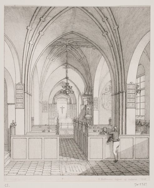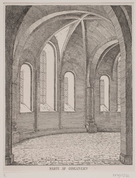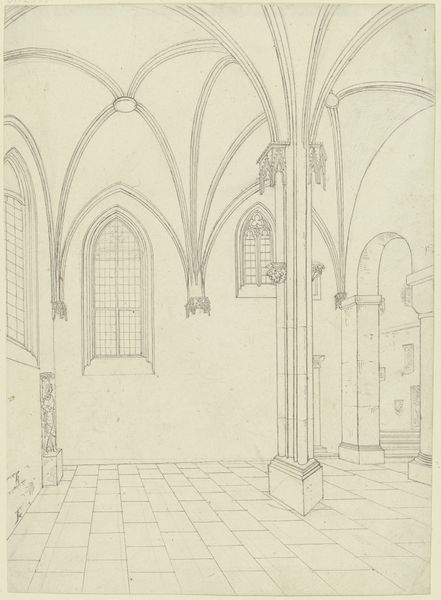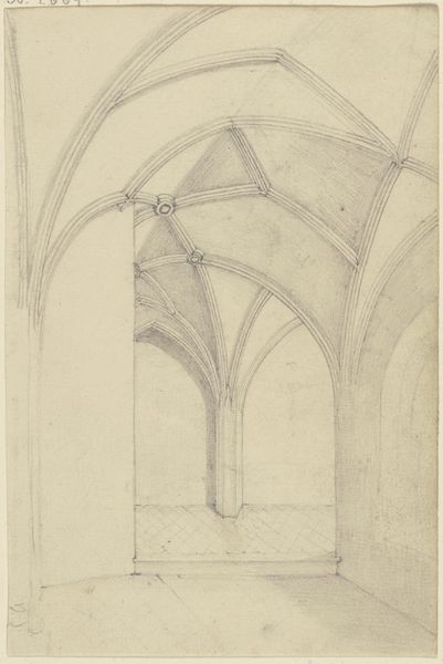 This architectural study was made by Karl Ballenberger using graphite on paper. At first glance, it's a simple sketch, but look closer and you'll notice the sensitive rendering of light and shadow. The drawing captures the weight and texture of the stone columns and vaulted ceiling. Ballenberger’s choice of graphite – a relatively inexpensive and readily available material – speaks to its function as a study, a means to an end. He is exploring the play of light in the hall, how it defines the space and articulates the architectural forms. But consider the broken wall in the background, the rough edges exposing the interior structure. Is this simply an exercise in capturing architectural detail, or is Ballenberger also commenting on the fragility of even the most solid-seeming structures? The material, the drawing, the subject: all invite us to look beyond the surface, and to recognize the complex layering of meaning that even a humble graphite sketch can contain.