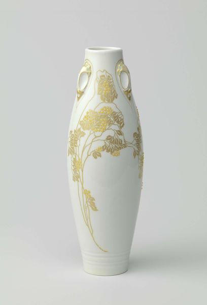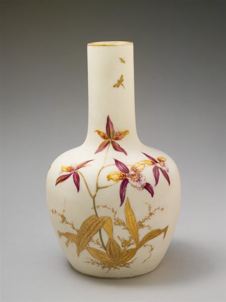 Curator: Oh, how lovely. I feel a sense of calm just looking at it. Editor: I see a delicate porcelain vase from around 1774 to 1784. It's called "Vase or Hunting Bottle of Painted Porcelain," and was produced in the Loosdrecht factory, now residing in the Rijksmuseum. I suppose its pale simplicity really does evoke that sort of quiet refinement that the Rococo style often strove for. Curator: Refinement is an excellent word! It's the understated palette of browns against the white that does it for me. It feels almost like a memory of a flower garden, softened by time. The brown almost resembles the sepia tones of old photographs, conveying an aesthetic elegance. It's like finding beauty in muted simplicity. What strikes you beyond the style? Editor: Well, the fact that this bottle imitates, both in shape and design, objects meant for hunting rituals, points to the adoption of aristocratic leisure pursuits by the upwardly mobile bourgeois class in the Netherlands during this period. Porcelain itself, a costly material to produce, acted as an accessible signal of status. Curator: It's funny you mention its social status because I instantly imagined it displayed in a grand hallway, or upon a woman's vanity filled with perfumes or tonics. Tell me, are the flowers specifically chosen for some hidden symbolism, or do they purely provide aesthetic value? Editor: In many ways, the flowers signal prosperity through the appreciation of leisure and decorative arts. Porcelain art during this time provided a controlled landscape where the elite and the rising middle-class projected ideals of class mobility onto natural forms, thereby legitimizing the aesthetic value as an index of virtue and gentility. Curator: Oh, I can definitely feel that projected ideal. Maybe I am picking up on that historical desire for beauty through virtue! Editor: Indeed. Curator: I appreciate this Rococo vase even more now, it is far more subversive and representative of wealth and class elevation through the quiet signaling of bourgeois aesthetic preferences, far more than it may seem at first glance.