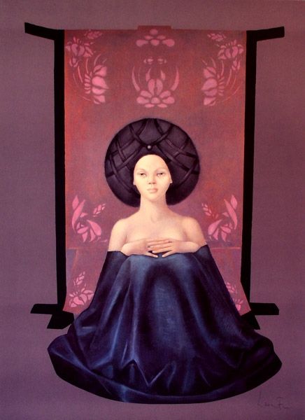 Curator: Here we have Troy Brooks' painting, "Lightningseed." Isn't she something? I find her utterly mesmerizing, though I can't quite put my finger on why. It's that gown, maybe, like captured sky, and those little floral flourishes – like someone decided to accessorize a Byzantine icon! Editor: Oh, she is compelling. Immediately, I'm struck by this sense of arrested sorrow. The downcast eyes, the stark lighting... it speaks volumes. And the halo... not exactly a traditional golden ring, is it? More like stray electrical currents, contained rebellion. Curator: That’s it exactly, rebellion! Brooks really captures something intangible about these women. It’s like they’re princesses of their own little empires, complete with internal monologues only we get a glimpse of. And this is acrylic paint – which sort of surprises me – it’s easy to miss it. I tend to get utterly lost in that theatrical blue... like an operatic dream, almost. Editor: Theatre is precisely the word. Note the ruff, that almost Elizabethan collar, confining yet dramatic. And those stockings! The delicate filigree pattern against the electric blue of the dress suggests a story – a power struggle, perhaps, between opulence and restriction, innocence and knowing. Curator: And Brooks' figures! Their faces always have this unique quality: they feel both retro and impossibly futuristic. It's like a pin-up girl from the 50s got lost in time and space and ended up here, on our gallery wall. Her style has been called everything from pop surrealism to modernism. The truth is, the sum ends up greater than its parts. It all feels... I don’t know, sacred and profane somehow! Editor: Absolutely. Look closely, and you realize everything points inward, down, toward her inner world. Even the glowing, ethereal quality seems focused and internal. And I can’t help but think of the seed metaphor. Lightning, the volatile power of nature, contained within something small, something pregnant with potential...a symbol that really says something, when you come to think about it. Curator: "Lightningseed," you've got to wonder if he chose the name before or after finishing this arresting artwork... Editor: Who can really say? But I know it resonates, long after one turns away.