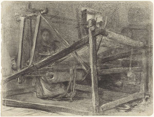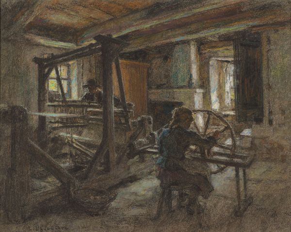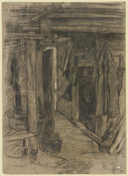 Petrus Franciscus Greive captured the intimate scene "Interior of a Stable" in a drawing. Here, we are invited into a space that resonates with the universal theme of shelter and containment. The most striking element is the large basket, an ancient symbol of gathering and nurturing. This echoes motifs found in Minoan art with the cornucopia, a symbol of abundance and prosperity. The presence of the basket also conjures the image of the cradle, a vessel of life’s beginnings. The barn and its tools signify humanity's relationship with nature. This partnership, although essential, can be demanding and filled with toil. These objects are not merely functional but carry a deep emotional weight. We can feel the weight of generations who have performed manual labor, their lives bound by these objects, reflecting the cyclical nature of agrarian life. Just as the basket contains, the barn itself protects against external elements, fulfilling our primal need for safety and security.