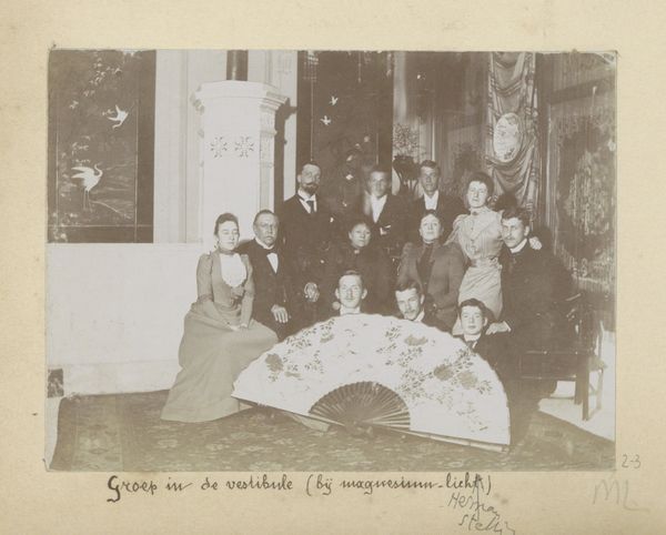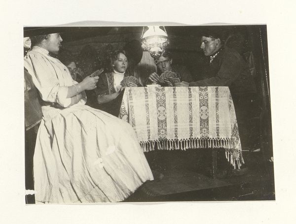 G. Hidderley made this photograph, Kaartende personen, capturing a group of people engrossed in a card game. The approach to capturing the scene feels casual, like a snapshot of a moment in time. Look at how the light illuminates the faces of the players and the tablecloth, while the rest of the room fades into shadow. The texture of the photograph itself adds to this sense of spontaneity; you can almost feel the graininess of the image. The way the subjects are arranged around the table, each holding their cards close, creates a sense of intimacy. It reminds me a little of Manet's paintings of modern life, capturing everyday scenes with a similar sense of immediacy. Ultimately, what strikes me about this photograph is its ambiguity. Who are these people? What are they playing for? The photograph invites us to fill in the gaps, to imagine the stories behind the faces around the table.