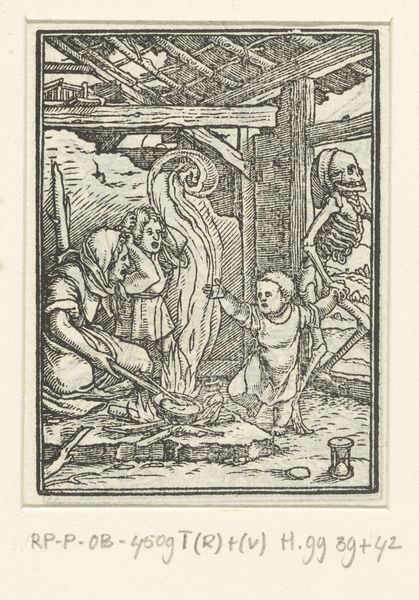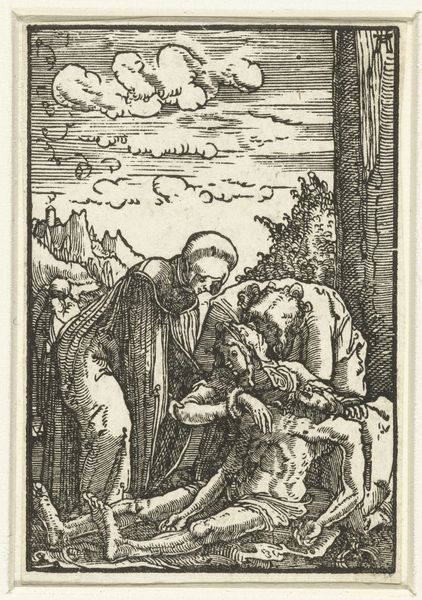Editor: This engraving, "Saint Jerome Kneeling Before a Crucifix and a Lion," dates from somewhere between 1500 and 1575. It depicts a gaunt, kneeling figure, presumably Saint Jerome, alongside a rather docile-looking lion and a stark crucifix. The mood seems penitent, perhaps even melancholic, and is made all the more striking by the medium itself. What significance do you find in the chosen imagery? Curator: The engraving's power rests precisely in those loaded images. Saint Jerome, a Church Father, translates the Bible. The lion, according to legend, becomes his loyal companion after Jerome removes a thorn from its paw. The crucifix? Symbol of faith, suffering, and ultimately, redemption. Notice how the artist positions these three figures – each embodies different facets of Jerome’s spiritual journey. Editor: So the lion isn't just a random animal, but a symbol too. What about the hourglass on the bookshelf? Curator: Ah, excellent observation! That's a potent symbol of mortality and the passage of time, often paired with Saint Jerome in art. Think about it - the hourglass, the crucifix, and the scholarly saint all point towards an awareness of time's fleeting nature and the importance of spiritual reflection before death. Doesn't the skull further develop the sentiment of impending death? Editor: It does! I'm now understanding it’s a layered representation – Saint Jerome, facing his own mortality, finds solace and meaning in faith. Are there more universal themes conveyed by these elements? Curator: Certainly. We can understand Jerome's dedication as mirroring humanity’s own confrontation with death. What is to be done when one has their time in the sun? This visual dialogue urges viewers to examine their own values and priorities, searching for deeper meaning beyond the temporal world. Editor: This has really changed my perception; the combination of the religious, the memento mori, and the relationship with nature paints such a full and intriguing picture. Thank you! Curator: And thank you for your astute observations. The artwork truly invites each of us to contemplate life's larger questions.