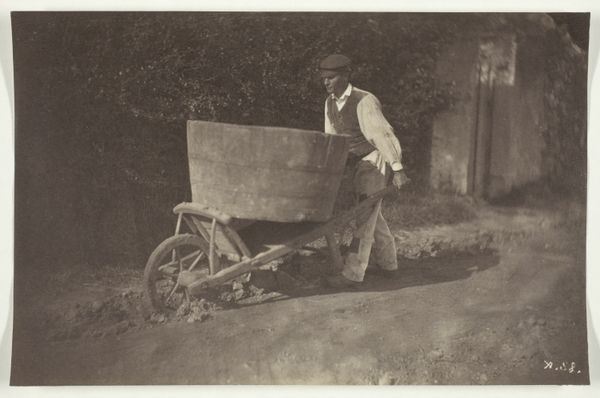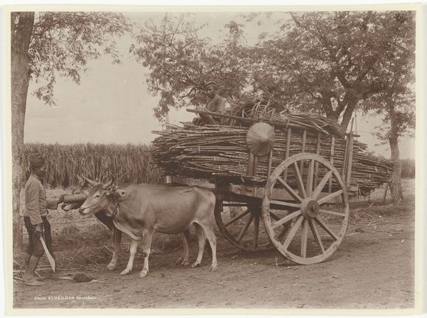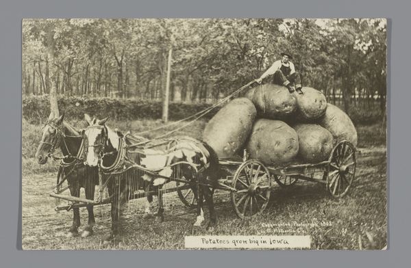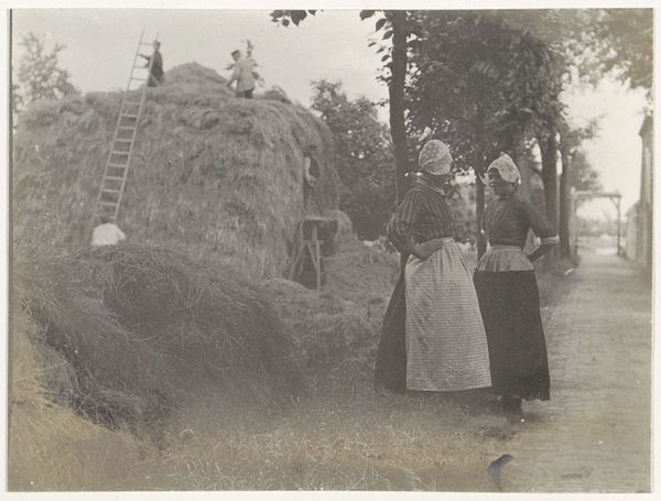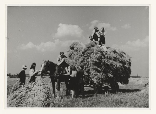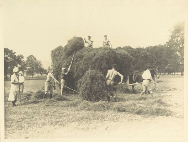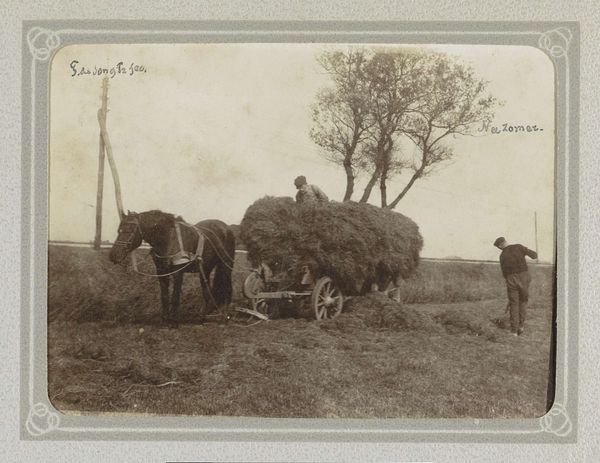 Curator: Standing before us is Richard Tepe's "Paard en wagen beladen met hooi," a photograph dating from roughly 1900 to 1930. Editor: There's a lovely, quiet quality to this image; a serene stillness despite the implied labor. The tonality contributes to this, it's quite subdued and evokes a specific feeling, like I can almost smell the hay. Curator: It's fascinating how Tepe captured a fleeting moment in the agricultural cycle. I'm drawn to the textures; you can almost feel the roughness of the hay and the worn leather of the horse's harness. Consider the tangible reality of farming. The relationship between humans, animals, and the land—all interconnected. This makes me think about our current disconnected relationship with resources. Editor: Yes, the sheer volume of the hay relative to the size of the horses and wagon also suggests a very particular relationship, especially considering how the workers look. I can't help but interpret this in terms of class, gender and the exploitation of human and animal labor during this period, a subtle resistance to industrialization, perhaps. Curator: Precisely. And even beyond that direct commentary on class, look at the materiality, which underscores both its cultural context, and perhaps hints at Tepe’s artistic goals. The process of development is very apparent. The print quality suggests mass production; that this photograph circulated fairly widely, impacting perceptions of rural life among different classes. Editor: It truly is an intersection of histories and material conditions, isn't it? It gives us space to meditate on all those elements, but in a subtle way, not bombastic, it suggests we could all use slowing down to think about this sort of context in general. Curator: I agree; Tepe provides a beautiful framework to connect and reflect about a particular world that resonates in our contemporary culture. Editor: It invites introspection regarding sustainability, the consequences of modernization, and labor inequities across social strata and eras.