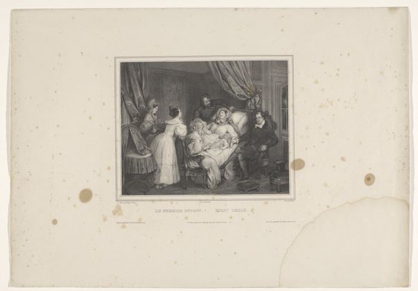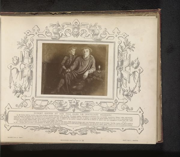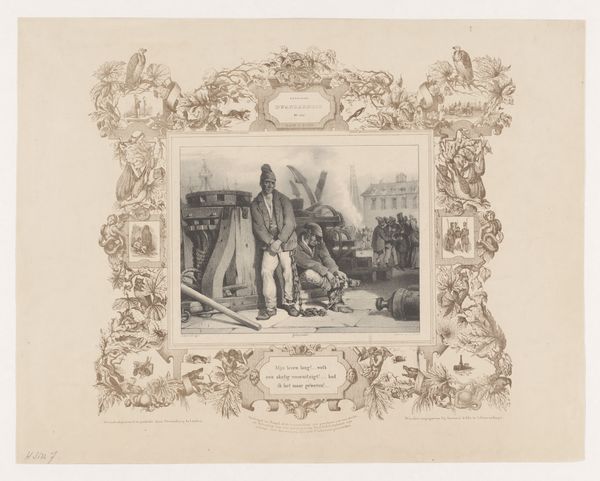 Carel Christiaan Antony Last created this artwork with etching. The print is structured within a decorative border of flowers and miniature scenes, framing the interior scene at its center. The use of monochromatic tones, primarily grayscale, creates a somber, contemplative mood. The composition directs our eyes to the interaction between the two figures. Last's work invites interpretation through its structure, where the external frame of societal symbols meets the intimate, internal exchange between individuals. What is the relationship between these characters? The lines and textures, achieved through etching, add depth and detail, drawing viewers into the heart of the scene. The balanced composition, with its symmetrical elements, creates a sense of order that contrasts with the implied narrative tension. This artwork functions not just as an aesthetic object, but as a study in the structural interplay between public image and private action, challenging us to decode its visual language.
