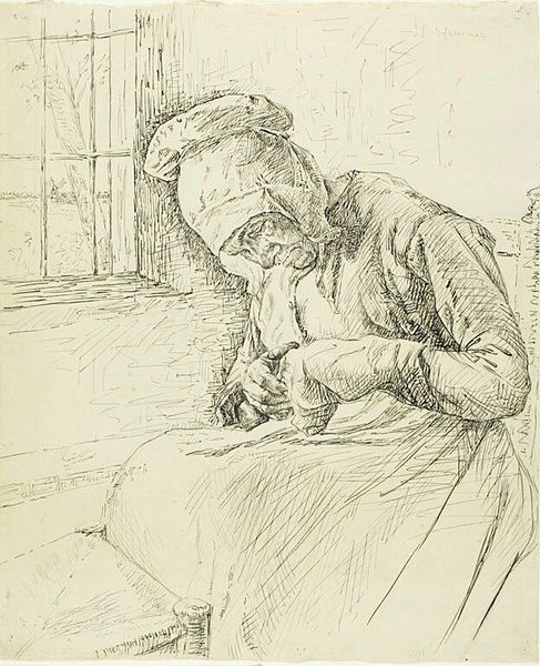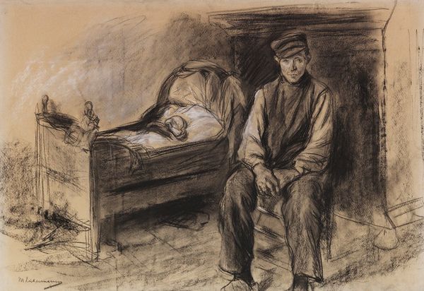 Albert Neuhuys created this drawing, "Dutch Interior with Figure of Old Woman," with charcoal and possibly some white chalk. Notice the figure of the old woman, her hands clasped in her lap, a posture seen across cultures and epochs. This gesture—hands folded—speaks volumes. It echoes in ancient Roman funerary sculptures, where figures rest eternally with hands clasped, and reappears in Renaissance portraits, symbolizing piety or contemplation. Think of the countless Madonnas, hands folded in prayer, or the stoic philosophers, lost in thought. The motif transcends mere representation; it embodies a state of introspection, perhaps resignation, that resonates deep within our collective memory. The psychological weight of this posture is immense. It hints at untold stories, the burdens of time, and the silent dialogues we hold with ourselves. Such recurring symbols are not static; they evolve, accumulating layers of meaning as they journey through art history.