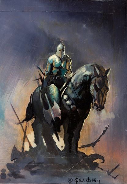 Boris Vallejo crafted this striking artwork "Gentle Path", a dance of colour and form that invites the viewer into its textured world. The composition is immediately striking: the muscular horse and its rider command the foreground, set against a backdrop of jagged mountains and brooding skies. The artist's use of light is particularly notable, casting the figures in a way that accentuates their volumes. Vallejo harnesses the interplay between realism and fantasy, challenging established meanings and categories. The landscape, reminiscent of Romantic sublime, contrasts with the figures posed in a way that is traditionally associated with classicism. We can see the relationship between the rider, the horse and the land as a complex visual language that goes beyond the surface. The painting's emphasis on texture through meticulous brushwork adds a tactile quality. Ultimately, "Gentle Path" invites us to engage with themes of beauty, and the sublime, all filtered through a lens of aesthetic formalism.