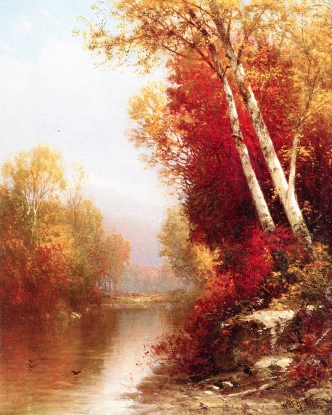 William Hart's "Autumn on the Lake" is a symphony of color painted with oils. The landscape is divided into tonal masses with hues of oranges, browns, and greens evoking the melancholic beauty of the season. The composition leads the eye from the hazy, light-filled distance to the solidity of the foreground. A careful arrangement of forms creates a sense of depth, yet there’s also a flattening effect, a hallmark seen in some landscapes that defies traditional perspective. This tension allows the viewer to engage with the painting not just as a representation, but as an object itself. Hart uses subtle brushstrokes to build form, yet the image is less about detailed representation and more about the emotive power of color and light. The treatment of light—diffused and almost palpable—suggests a concern with capturing a fleeting atmospheric condition. Consider how Hart uses the formal elements of color, composition, and light not just to depict a scene, but to evoke feeling. The aesthetic experience is not a passive observation, but an active interpretation.
