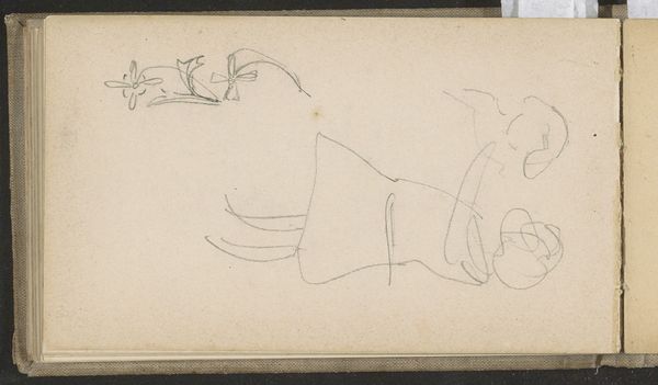 Curator: This pencil drawing, titled "Twee figuren," or "Two Figures," is the work of Isaac Israels, likely created sometime between 1923 and 1934. It’s currently held in the Rijksmuseum collection. What stands out to you initially? Editor: There's an incredible sense of spontaneity and intimacy here. It feels almost voyeuristic, like catching a private moment of repose. The minimal lines give it an unfinished quality. It’s very direct. Curator: I agree. Israels was fascinated with capturing modern life as it unfolded. We see that quickness of hand across his oeuvre. And, of course, portraiture offered artists the opportunity to negotiate social identity through pose and implied narrative. What narrative do you read here, even in its implied state? Editor: To me, these figures, especially the lower one, seem weary or perhaps unwell. It's interesting how even with so few lines, Israels conveys such a strong feeling. You almost want to ascribe to the sitter agency and maybe an understanding of their participation in larger colonial exploitation in the East Indies? Curator: Precisely! And considering the historical context—Israels had returned to the Netherlands from his extended period painting in the Dutch East Indies only a few years earlier—it is possible he was capturing his impressions of how society ladies interacted or idled their time during his time painting back in Europe. We might read their positionality as related to a time of relative prosperity in some societies while exploitation and repression persisted elsewhere. Editor: Exactly, it highlights that the depicted ‘leisure’ comes at someone else's expense. Even the sketch's very ephemerality underlines the transient nature of such privilege, of those sorts of power relations. I’m also drawn to how unidealized the figures appear. It feels like an anti-portrait. Curator: Israels, while often working within established genres, did frequently push against the boundaries of academic tradition. It's work such as "Twee figuren" that demonstrates he had an eye for distilling and communicating a subtle and modern sense of detachment within a social structure. Editor: Thinking about art's function within societal norms…this sketch does seem to break from established practices! It gives one insight into possible subversive observations or interpretations related to both class and gender. Curator: A beautiful observation. This sketch provides an intriguing perspective from Isaac Israels’ perspective, one that can lead us to examine larger cultural considerations around politics and society during that era.