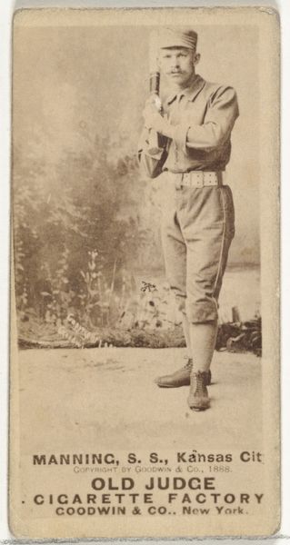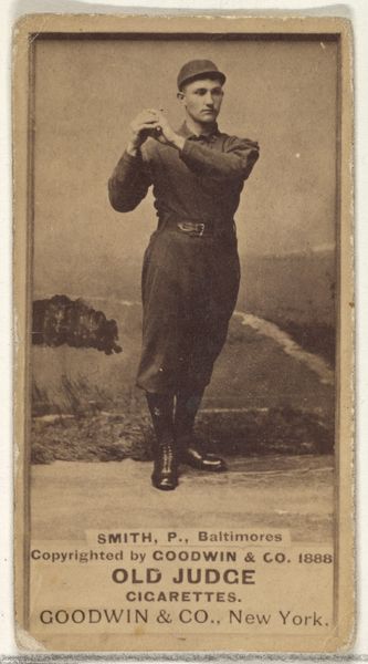 Editor: So, this is "Kilroy, Pitcher, Baltimore Orioles," from the Old Judge series, created in 1888 by Goodwin & Company. It's an albumen print, which I find kind of charming for a baseball card. There's something so posed about it. How do you interpret this work, particularly its role in its time? Curator: This card isn't just about baseball; it's about the burgeoning culture of celebrity and consumption. Think about it: baseball's popularity was skyrocketing, and at the same time, so was the marketing of consumer goods, like Old Judge Cigarettes. What’s particularly striking to me is how the commercial need to produce many of these cards shaped its aesthetics. Editor: That's fascinating. I hadn’t thought about how demand would impact artistic choices. The player's pose feels deliberate. Was that influenced by advertising needs, too? Curator: Absolutely. It's a calculated image meant to portray an ideal. This carefully constructed representation promoted both the athlete and the product. Consider the implications: baseball, smoking, and ideals of masculinity are all subtly intertwined in the public consciousness through pieces like this. Editor: So, it’s part of a larger phenomenon – shaping perceptions, linking products to aspirational figures… almost like early influencer marketing. It's interesting to think about how this connects to the public’s reception of baseball back then. Curator: Precisely. And the mass production makes it incredibly relevant to understanding popular culture. These weren't high art; they were designed for wide distribution, influencing and reflecting societal values. This type of card gave players a face and promoted a sense of collective identity among fans. Editor: Wow, that provides an entirely new lens for how I look at trading cards. Seeing this image in terms of mass culture and marketing… it's changed how I view it. Curator: That intersection is precisely where the power of art lies.