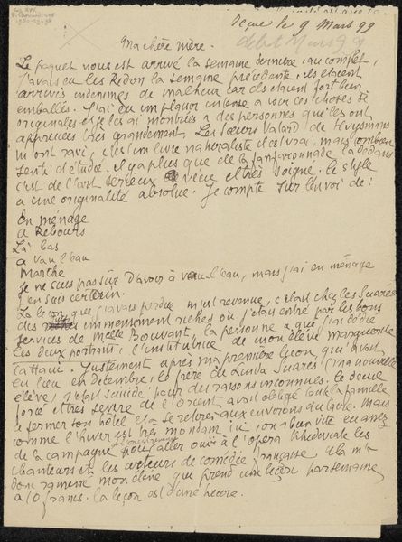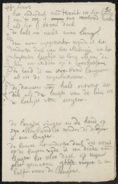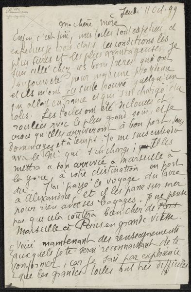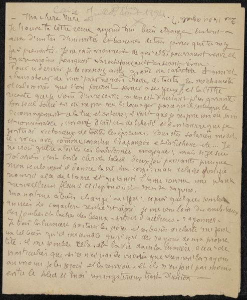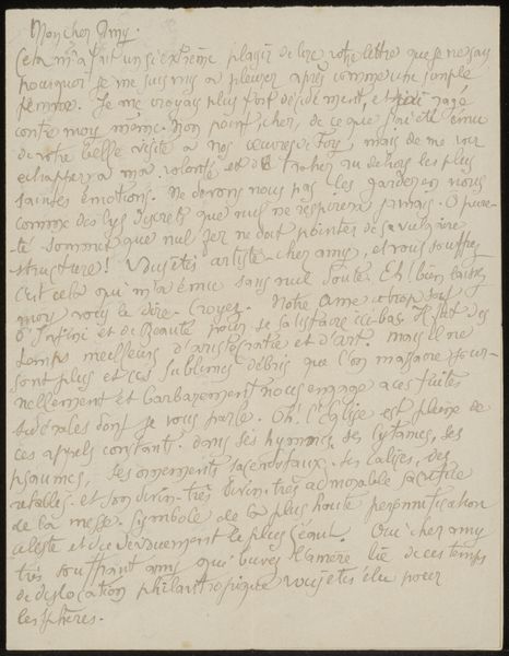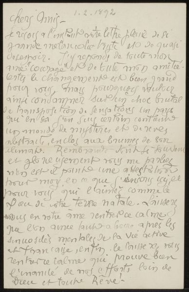Curator: We’re looking at a piece titled “Brief aan Héloïse Bernard-Bodin,” dating from the period 1878 to 1941, created by Emile Bernard. It's a drawing in ink on paper, showing some intimist and symbolist approaches, consisting primarily of a handwritten letter. Editor: It gives off a feeling of fragility...the kind that comes with glimpsing someone else's private thoughts. The cramped handwriting makes it feel like an urgent whisper. I wonder what's being confessed. Curator: In its historical context, such correspondence often served vital roles in personal, artistic, and social networks. The materiality is intriguing: a fragile piece of paper containing ink, elements so accessible yet bearing such a weighted message across time. Bernard, known for his Symbolist works, perhaps embedded layers of meaning, hidden under the veil of everyday discourse. Editor: You are totally right! It also appears quite intentionally constructed with an incredible dynamic that emphasizes verticality, doesn't it? And that heavy black ink – a stark contrast against the paper that makes it look aged... I am definitely getting that sense of looking at someone’s important declaration! I bet that Heloise saved it dearly... Curator: The letter provides some kind of an authentic slice of life that could provide invaluable historical insight into societal concerns. The piece's intimate tone can speak to viewers irrespective of how separated we are from that period by evoking that perennial element: human emotion. Editor: Absolutely. There's something beautiful in the universal vulnerability of this message. Imagine the weight those ink strokes held, not just for Bernard, but for Heloise receiving this long ago. So…the essence, what seems truly special here is that even today—all these years later—we have an unexpected opportunity to take a step into their life, don’t you think? Curator: I concur entirely. It transcends being a mere historical object and stands as a poignant embodiment of emotional experience. Editor: A portal through time and emotions. Not bad for a piece of paper and ink, eh?
