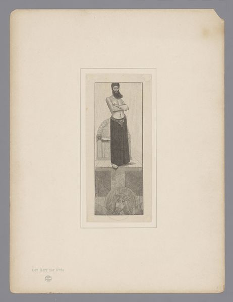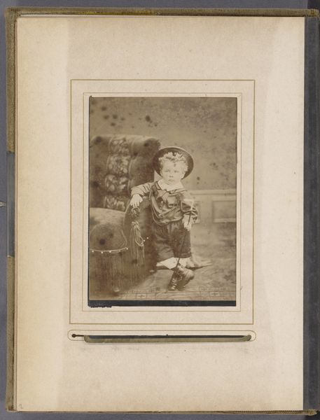 Editor: This is a photograph titled "Portret van een zittende jongen met hoed in de hand," which translates to "Portrait of a seated boy with hat in hand," created sometime between 1875 and 1885 by Eugène Guérin. The sepia tone gives it such an antiquated feel. The subject's posture seems quite stiff and posed. What stands out to you in terms of formal elements? Curator: Consider how the photographer manipulates light to create form. Observe the subtle gradation of tone across the backdrop, the play of shadows delineating the boy's clothing and the textures of the chair. Notice the geometrical rigor in its composition, dividing the space with vertical and horizontal lines of the seat's edges. Editor: That's a good point, there's definitely a contrast between the softness of the backdrop and the rigidity of the props, it nearly flattens the subject. I see there are very sharp, perpendicular angles within the frame of the photo, within the borders of the books in the foreground. Is there something significant about how Guerin frames his subjects so strictly? Curator: It invites contemplation of the real versus the representational. Guerin isolates and elevates certain elements, thereby creating meaning within the constraints of photographic realism. Do you feel it effectively emphasizes qualities beyond mere appearance? Editor: I think so. Analyzing it this way highlights the intentional choices. At first, it seems like a simple portrait, but now I'm realizing the strict composition emphasizes specific components such as form, shadow and texture to deliver greater meaning. Curator: Precisely! Such focus moves beyond superficial content, leading towards formalist assessments of visual dynamics.