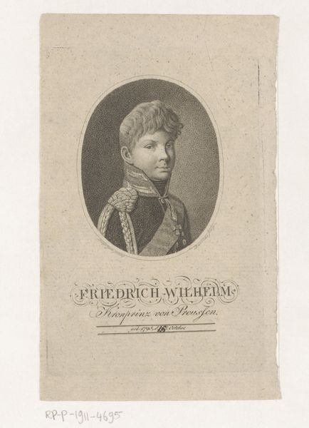 This is Friedrich Wilhelm Bollinger's portrait of Friedrich Wilhelm Ludwig of Prussia, later Wilhelm I, rendered as an engraving. Bollinger created this portrait in an era of shifting European power dynamics. The image, with its careful attention to Wilhelm's youthful features and the detailed rendering of his military regalia, subtly hints at themes of succession and imperial destiny. Consider the implications of depicting a young royal in military attire. Does this choice speak to the expectations placed on young men of power, or does it reflect Prussia’s militaristic culture at the time? Think about how the symbols of power are carefully presented here, creating an official identity, while perhaps also masking the personal and emotional dimensions of the subject. This portrait serves as a statement of identity and power, carefully composed within the strictures of its time.