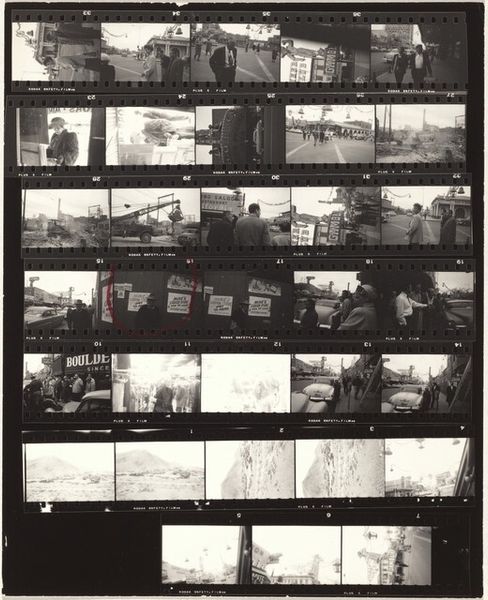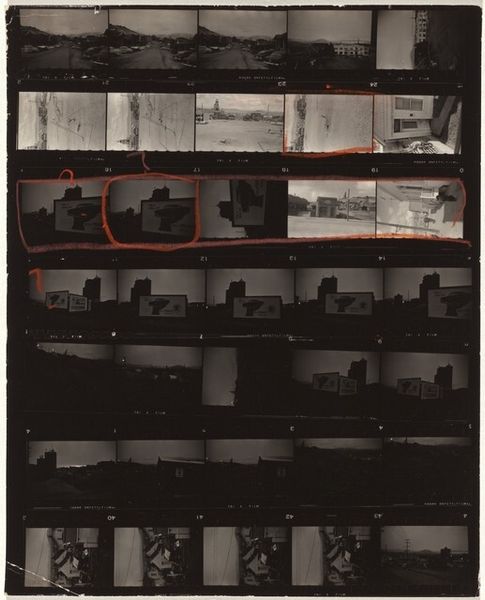 Curator: This is a contact sheet from Robert Frank, created around 1955, and titled "Guggenheim 19--Charleston, South Carolina." The medium used is gelatin silver print. Editor: What immediately strikes me is the fragmented nature. Rows and rows of almost identical images, like memories trying to piece themselves together. There’s a clear narrative trying to be expressed with social overtones, yet a certain ambiguity too. Curator: Absolutely. As a contact sheet, it gives us direct insight into Frank's working method, showcasing the sheer volume of images he considered for his seminal book, *The Americans*. The repetitive frames expose the labor involved in image-making, highlighting how the photographic process, the materiality, serves his critical views on American society at the time. Editor: I’m drawn to that image isolated with the red marker. It feels symbolically charged – two figures, maybe young women, silhouetted against a bright background, framed between traffic signs and the industrial architecture. The contrast seems stark, indicative of some significant division. Curator: The isolation of that particular frame through editing is so key. This image suggests a critical dialogue of social context within the segregation era of the South. You could look at how Frank captured vernacular landscapes; his work isn't about the grand vistas but ordinary locales—elevating what society overlooks. Editor: The traffic signs alone carry potent symbols. I read those not only as physical directions but social constraints. They serve almost as warnings, reflecting restrictions and divisions of that era. This connects back to the choice of the figures’ appearance, perhaps also a purposeful attempt at depicting alienation within common, shared spaces. Curator: Frank disrupted the traditional ideas regarding documentary photography. The use of snapshot aesthetics with visible grain was revolutionary, impacting photography that moved beyond pristine landscapes. Instead, we are forced to deal with everyday environments. Editor: Seeing the entire contact sheet recontextualizes the power and art that resides behind an individual selected shot. We view not only what Frank created as a singular photographer, but observe his own critical eye that, decades later, can lead to us seeing what he thought crucial during production. Curator: Indeed. Thinking about the process allows one to consider just how social narratives are consciously chosen by artists; a critical and very involved process in how art engages us, especially over the course of history. Editor: It really highlights how art transforms a moment into a timeless emblem.