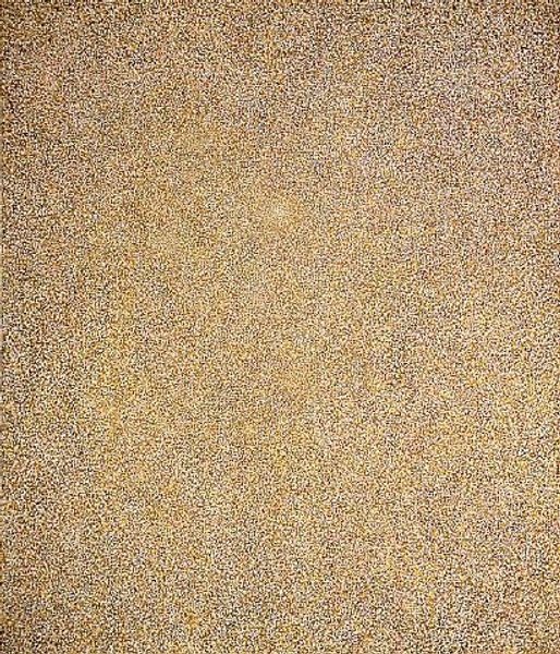 This painting, Untitled (Alhalkere), was made by Emily Kame Kngwarreye, and it's like looking at a field, or maybe sand, rendered with endless small dots. There's something meditative about this kind of mark-making. You can imagine the artist in the studio, repeating the same simple gesture, over and over. But there's variation in there too, little shifts in color and spacing. The dots range from pale ochre, to warm browns and near whites which give the surface an inner light and movement. The texture feels almost granular, and these tiny circles seem to float on the surface. One particular area, maybe halfway up and slightly to the left, has a cluster of darker brown dots that pull your eye in. It's like a focal point that emerges from the overall pattern. Kngwarreye’s work, in its use of repetitive mark making, reminds me of Agnes Martin. Both artists use a kind of all-over composition, filling the space with subtle variations. You could stare at either of them forever. And that's a good thing, right?