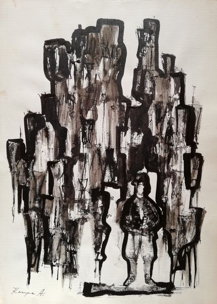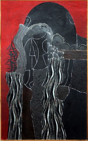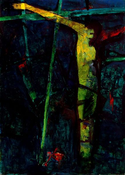 Curator: Looking at Richards Ruben's "Untitled" from 1951, an oil painting rendered in the abstract expressionist style, one is immediately struck by its somber and spectral qualities. What are your initial impressions? Editor: The composition, almost monochromatic, evokes a visceral reaction. It’s a masterclass in using tonal values to suggest form, even without distinct lines. The dark blues and grays are punctuated by strokes of lighter pigment that are very subtly suggestive. Curator: It does bear many marks of its time, reflecting the anxieties of the early postwar era through its fractured forms and gestural application of paint. Thinkers such as Adorno wrote about the impossibility of art after the Holocaust. The forms hint at representation while resisting it. It invites viewers to confront a world forever altered. Editor: True, but I’m compelled by the internal structure. Note the way the eye is led upwards through the converging strokes of the pigment to imply forms; it's not just chaos. There is an underlying geometry, a series of interlocking shapes. There's a certain structural intelligence that shapes even the most 'spontaneous' mark. Curator: Considering its historical context, it would be easy to assume the artist intended this painting as an exercise in trauma, but perhaps Ruben was questioning the possibility of landscape painting itself in the modern world. Consider the rise of the suburb—and the displacement of rural modes of life. Editor: That’s certainly plausible. From a purely formal point of view, the impasto, applied with a vigour that seems almost frantic, makes the oil medium its own statement, like a three-dimensional poem. Do you agree that it almost makes you want to reach out to feel it? Curator: Absolutely. The texture adds another layer to its engagement with the natural world. It also suggests the artist's physical engagement in the painting, gesturing not just at the themes, but his active and subjective position. The 'painterly' quality indexes a perspective of masculinity rooted in hard labor. Editor: Precisely. So, Ruben’s visual language becomes both personal and reflective of art history, wouldn't you say? Curator: I agree; and perhaps we too have each added our own personal perspectives through a conversation situated in history. Editor: An interesting experience, highlighting how an artwork, even without a title, still provokes diverse interpretations depending on the observer's framework.