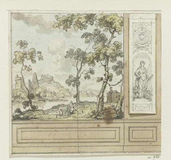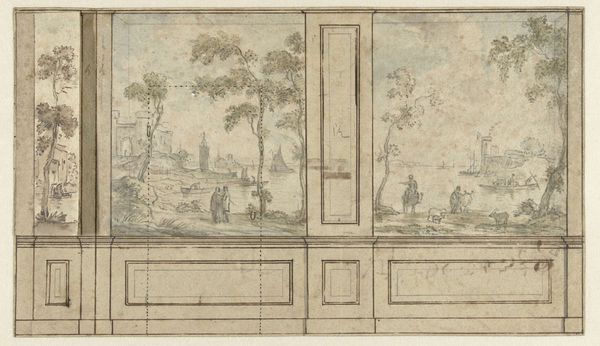 Curator: Here we have Jurriaan Andriessen's "Ontwerp voor kamerwand," a design for a wall panel, dating from somewhere between 1752 and 1819. It’s done with drawing, watercolor, and line work on paper. What are your initial thoughts? Editor: It's undeniably tranquil, almost dreamlike. The soft watercolors lend it an ethereal quality, and the landscape pulls the eye deep into the scene despite the fairly rigid paneling. I'm curious about that juxtaposition. Curator: Precisely. It is a rendering of societal intention! Think of the social contexts driving the Dutch penchant for both elaborate interiors and the idealized landscapes they contained. These designs offer a fascinating look at the artisan's intended relationship between luxury and the evocation of natural spaces in interior design. Editor: Absolutely. Beyond the sheer aesthetic pleasure, what are the symbols and narratives woven into the landscape depicted within the panel? The figures clustered near the water, the lone boat... they feel laden with meaning. Curator: That genre scene contributes, no doubt, to its intended function. The workers and boats, the figures on the hill are meant to be interpreted through the culture, commerce, and consumption they symbolize. These paintings speak volumes about a wealthy population's relationship with those that facilitate the wealth. The paper the work is rendered on also reminds us of material scarcity and the wealth required to create such work. Editor: Yes, but even so, the way those figures are placed within the wider composition – it evokes a sense of fleeting moments captured and perhaps glorified. We have a vision of industry and progress imbued with the weight of human activity and narrative possibility. Curator: That it might seem both fleeting and highly finished tells us much about the culture that brought it into existence. Editor: Indeed. Analyzing the images, the processes, and the context unlocks how this room intends to cultivate and manipulate symbolic understanding. A powerful commentary on how a domestic space becomes a stage for shaping identity. Curator: Well, I’m struck again by the tension between that idealized image and its function, that’s been a good reminder to attend to this particular context of consumption and to reconsider our relation to materials at hand. Editor: For me, reflecting on the image, thinking about its symbols—offers renewed insight on our lasting drive to imbue spaces with symbolic weight and to capture narrative in the spaces we inhabit.