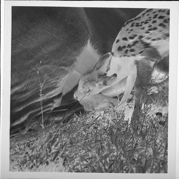 Curator: This evocative photograph by Jack Gould captures a tender moment between a fawn and a cow, simply titled "Untitled (baby fawn and cow, close-up view)". Editor: It feels so vulnerable. The closeness, the softness of the monochrome palette – it speaks to dependence and protection. Curator: Indeed. We can read this pairing through lenses of interspecies relationships, challenging anthropocentric views and prompting discussions around animal rights and welfare. The fawn, already a symbol of innocence, juxtaposed against the maternal figure of the cow… Editor: And the cow as a maternal figure is key; for centuries, the cow has signified nurturing, fertility, and the earth's bounty. Seeing the fawn sheltered in her presence, it strengthens that enduring motif. Curator: Absolutely. These intertwined symbols provoke thought about the complex ethical dynamics we face in our interactions with the natural world. Editor: It seems this image invites us to re-evaluate our relationship with animals beyond mere utility. Curator: Precisely. This simple photograph reveals a deeper connection. Editor: A connection reminding us of shared vulnerabilities.