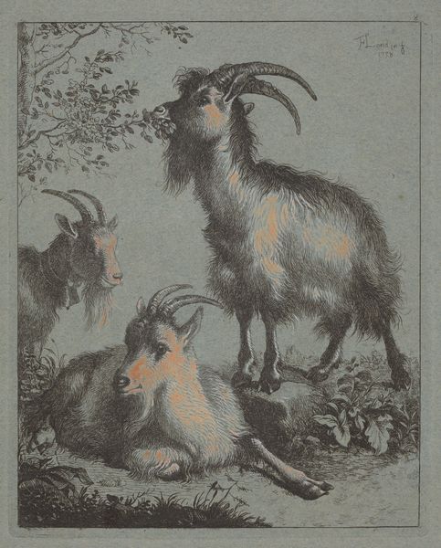 Editor: This is Francesco Londonio’s etching, "Goats." It shows three goats in a natural setting. I’m struck by the detail in the rendering of their fur. What can you tell me about this artwork? Curator: Notice how Londonio meticulously depicts each hair, attending to the labor involved in creating such detail. The availability and cost of etching materials at the time would influence the scale and intricacy of the work. How might this relate to the emerging market for pastoral imagery? Editor: So, the materials and market influenced the depiction of something seemingly simple, like goats? It makes you think about the social context of art production. Curator: Precisely. Understanding the work involves understanding the economic and material conditions that shaped its creation and consumption.