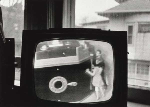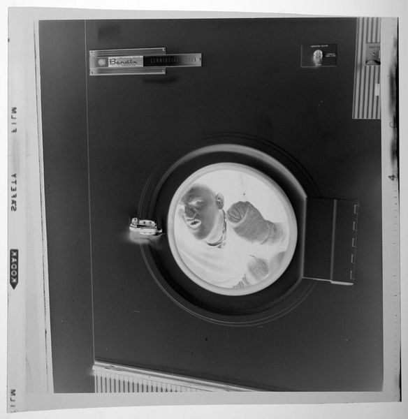 Editor: This is Jack Gould's "Untitled (party in laundromat, person inside washing machine)," and it's a gelatin silver print. The high contrast and unusual subject matter create such an odd tension. What do you see in the stark composition? Curator: The stark contrast certainly dominates. The strategic use of light and shadow to define form is striking. The geometric rigidity of the washing machine contrasts with the organic shapes of the human figures. Do you think the artist is exploring these dichotomies? Editor: That's an interesting point. I hadn’t considered the contrast in shapes. I'll definitely look at it differently now. Curator: Precisely. The formal elements offer ample insight into the artist's intentions.