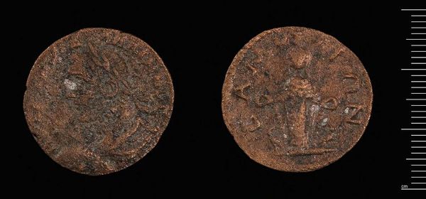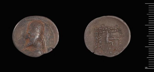Curator: This coin, attributed to Mithradates VI Eupator, now residing in the Harvard Art Museums, presents a fascinating, if corroded, glimpse into royal iconography. Editor: My first impression is one of faded power—the details are worn, but even through the tarnish, I sense a potent symbolism struggling to surface. Curator: Absolutely. Consider the imagery: likely depicting a ruler and perhaps a deity, these aren't just images; they're carefully constructed narratives, intended to project authority. The creation and distribution of currency was a critical part of expressing Roman influence. Editor: And to what end? The coin’s materiality – its very existence as a circulating object – speaks to the broader socio-political aims of Mithradates, doesn’t it? A tangible reminder of his reign in every transaction. Curator: Precisely. It’s a potent reminder that even the smallest artifact can hold volumes about the ambitions and anxieties of its time. Editor: Looking at it this way adds so much weight to such a small object.