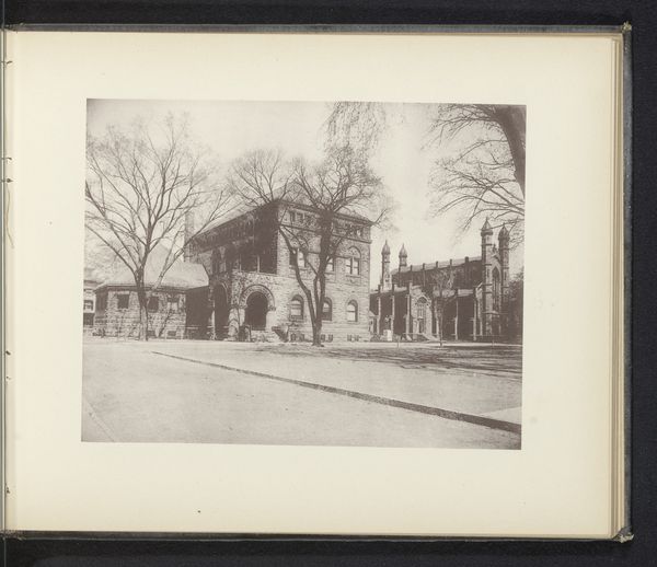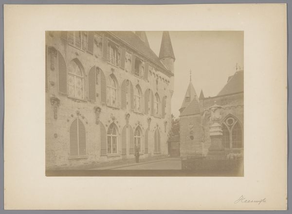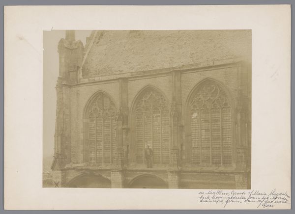 Curator: Immediately, I feel a sense of quiet solitude, almost melancholy emanating from this image. It’s all hushed sepia tones. Editor: This is a photograph, most likely taken sometime between 1880 and 1910, that captures a view of the Grote Kerk, or the Church of Our Lady, in Dordrecht. It's an impressive piece of architecture. Curator: Monumental, but made diminutive somehow. The positioning with the trees framing either side, almost blocking our view... it’s as if the photographer wanted to capture it at a remove, making it part of a natural landscape. I find that choice fascinating. Editor: The church itself has a fascinating history, especially within the context of the Reformation. The Dordrecht Synod, a major international conference of Reformed churches, took place here in the early 17th century and had significant political and theological repercussions for the region. This architecture comes loaded with meaning about shifting power dynamics in Dutch society. Curator: Yes, the building dominates the view as you’d expect a symbol of that magnitude to, yet the photographer presents the monumentality modestly. This approach almost democratises the symbolic dominance – which I think connects beautifully to the rising movements and reformations you mentioned. What else strikes you when considering technique? Editor: The soft focus and limited depth of field definitely lend an ethereal quality, a romantic longing, if I dare use such a term. It’s bathed in a delicate light; you see how that mutes all the sharp lines, creating this rather harmonious, even dreamlike atmosphere. Curator: I do wonder about the absence of people. Their omission seems pointed—emphasizing the structures, the institutions and perhaps even ideologies that form society in the absence of those that comprise it. That deliberate quietness seems as potent as if they were present. Editor: And maybe it reveals the transience of human experience in contrast to the perceived permanence of such structures. Thinking about art, history, architecture, society all meeting each other makes my mind really whirl! It shows me there's always more than one angle from which to view anything and more stories waiting to be uncovered, right? Curator: Precisely. This visual record leaves space for considering how shifts of power can so often quietly ripple. Thank you.