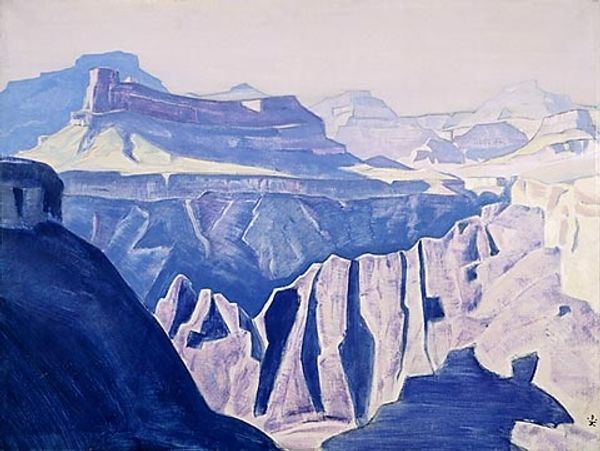 Nicholas Roerich painted this dreamscape of interlocking forms in shades of indigo, lavender and white. Roerich seems to suggest that the image is built up in layers. You can see this in the way the blue mountains overlap, creating a sense of depth and distance. The paint application is quite flat, but with visible brushstrokes, adding to the tactile quality of the painting. The surface is chalky and dry, and the contrast between the dark blues and the pale whites creates a kind of vibration, as if the landscape is shimmering in the fading light. The largest mountain on the right, with a monastery perched on top, looks impenetrable. It is built from sharply defined blocks of blue and is surrounded by glowing, almost luminous white. This creates a contrast between the solidity of the built structures and the ethereal quality of the surrounding space. It puts me in mind of Hilma af Klint, another mystic who sought to capture spiritual truths through simplification and abstraction. With both, the subject matter lends itself to endless interpretations.