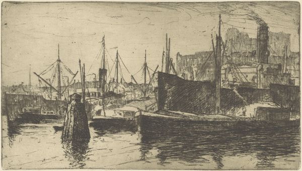 Willem Adrianus Grondhout made this etching called 'Op 't IJ', we don't know exactly when. The beauty of an etching lies in its lines, and here, they create a world of soft focus and quiet energy. Look how the reflections in the water aren't precise copies, but shimmering, broken strokes. This is the real stuff, the kind that happens when you’re not trying to be perfect, but just letting it flow. The buildings in the distance are hinted at with the faintest of marks, as are the figures wading in the water. It's the spars of the sailing ships which are most prominent, creating a kind of cage against the sky. Each mark is a decision, a little adventure. It reminds me of Whistler, but with a Dutch directness. It's a conversation, etching to etching, across time. Art isn’t about answers, it’s about the questions we keep asking each other.